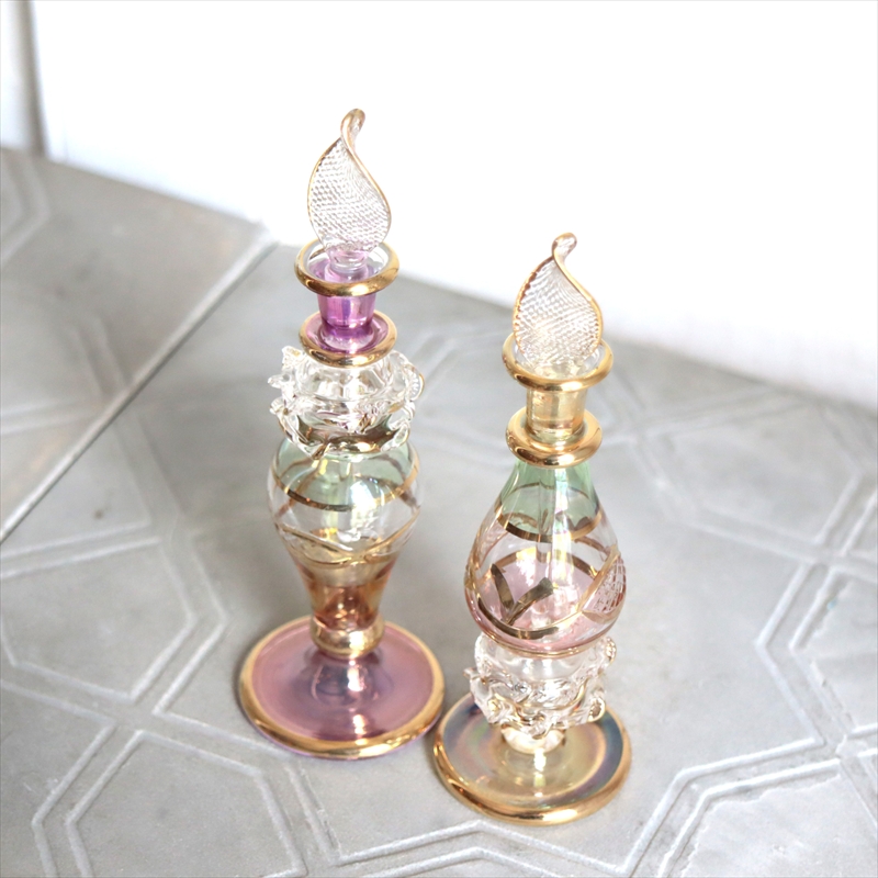 ガラス発祥の地と言われるエジプトは、現在でもシャンデリア用のガラスビーズをはじめ、クオリティの高いインテリアガラスが作られています。古代から作られてきたといわれるガラスボトルは、きらびやかでエキゾチックなムードたっぷり!切子細工で表現された草花モチーフやゴールドの着彩など小さいながらも職人さんの技が光っています。
