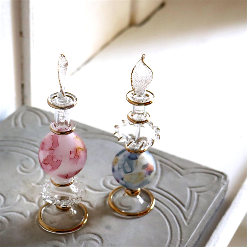 絵の具をにじませたようなマーブル模様が魅力的な香水瓶。エジプトのカイロにて、職人さんが一つ一つ手作りしたもので、水彩絵の具をにじませたようなランダムなペイントが施されています。