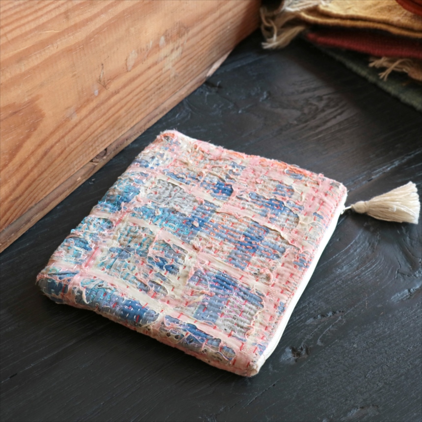 使い古された民族衣装のサリーやドゥパタを重ねて、刺し子刺繍をした伝統的な手仕事の布を使っています。表面のコットンは擦り切れているところもあるほど使い込まれていて、ヴィンテージ感たっぷり。