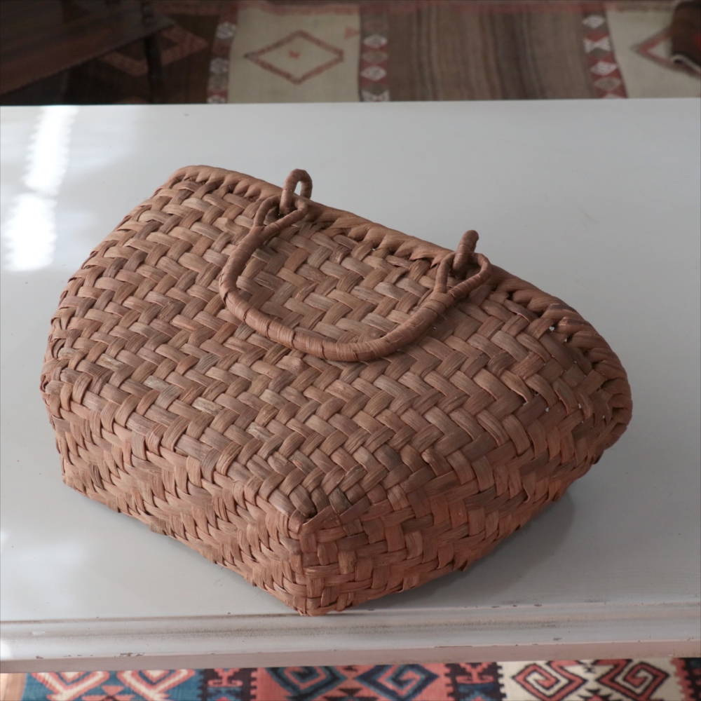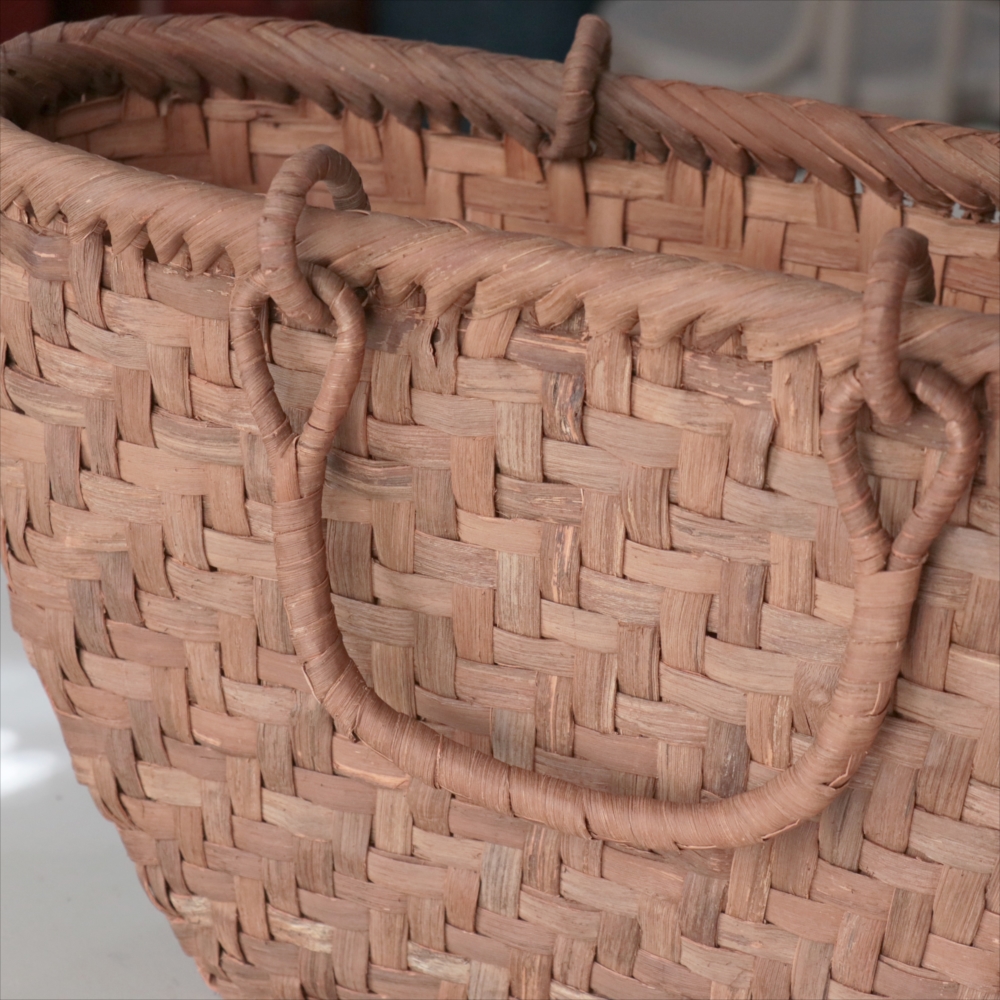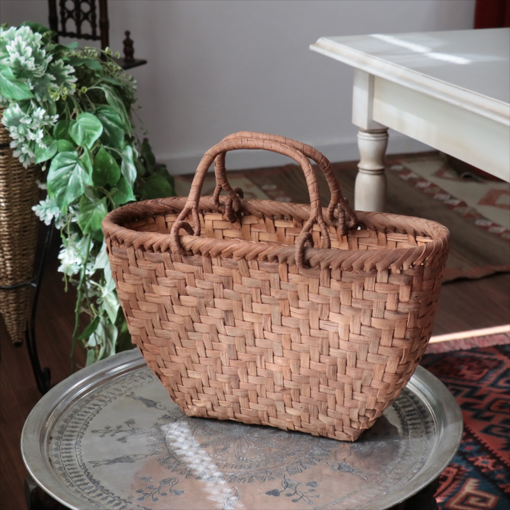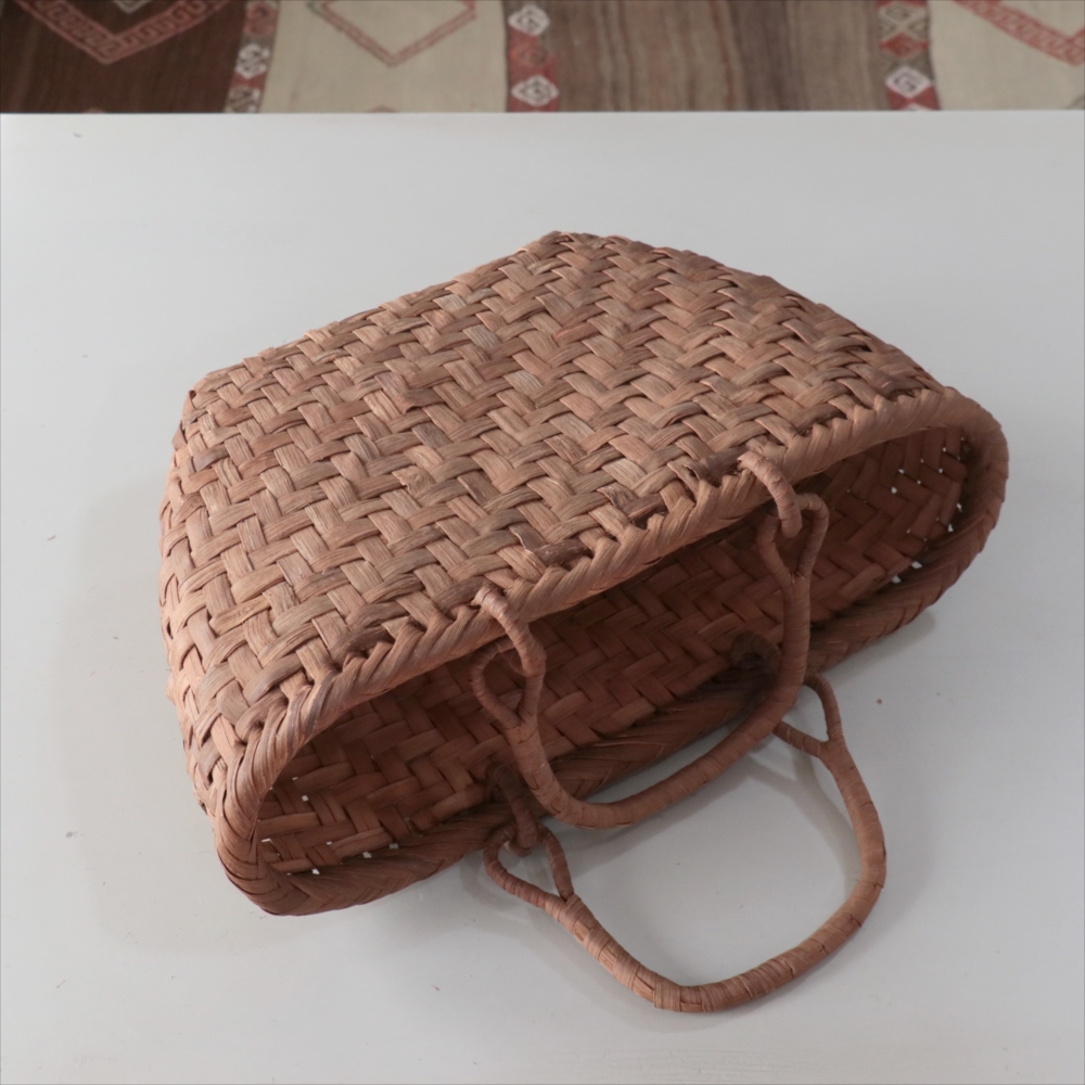 マルシェバッグと名づけられた大きめのやまぶどうのかごです。左右の曲線がきれいな仕上がりで、安定感もあります。持ち手は稼働式のリング手で、実用的。内布はないタイプなので、自分の好きな生地で巾着や風呂敷包みを入れたりして、アレンジしてお使いいただくのがおすすめです。
