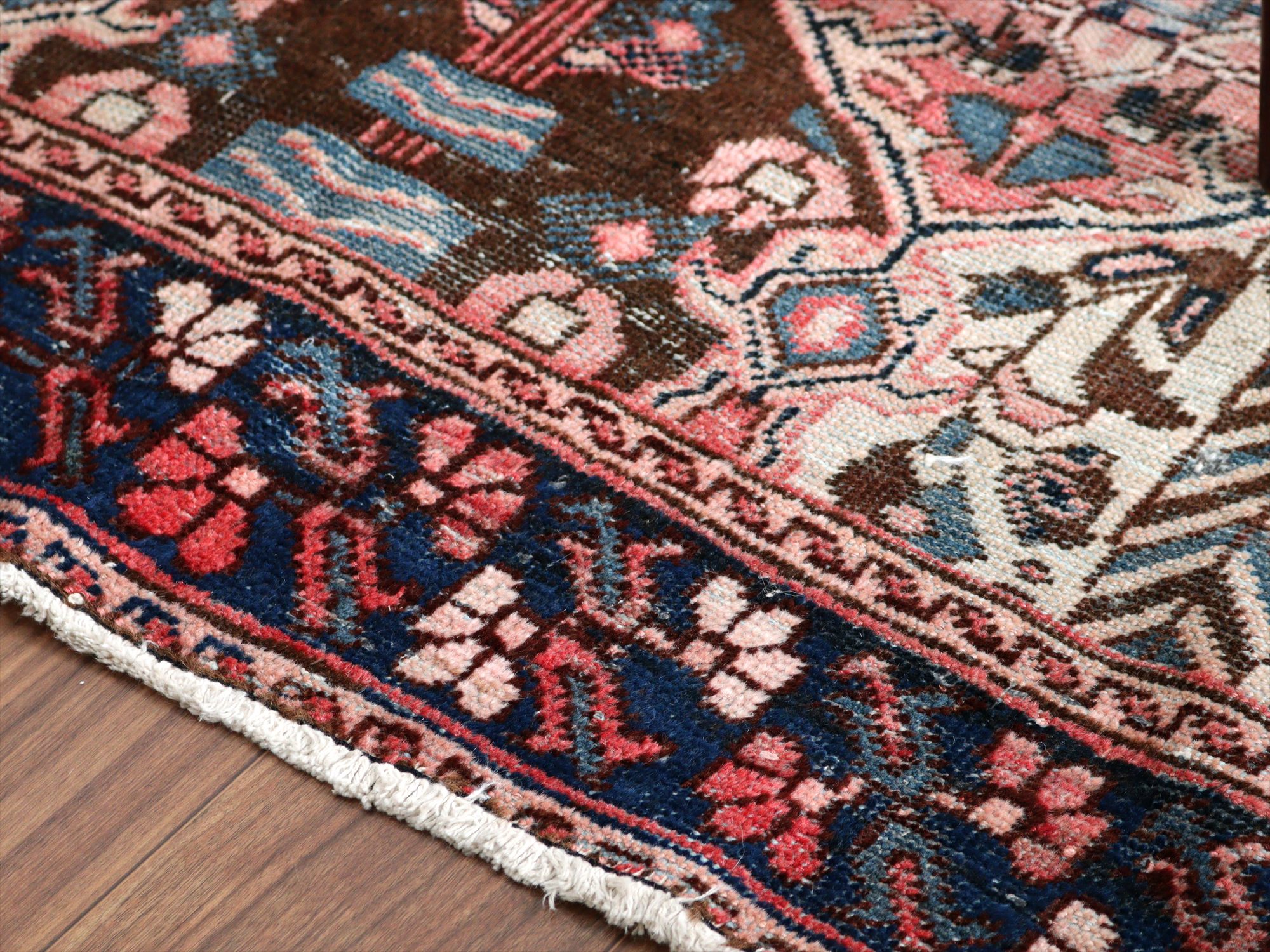 全体のカタチにゆがみがあるほか、表面のパイル(毛足)に擦り切れている部分が広範囲にあります。使い古した雰囲気を楽しめるよう、修理はなく写真の状態でお届けです。じゅうたんの経糸はしっかり残っているので、まだまだ長くお使いいただけます。