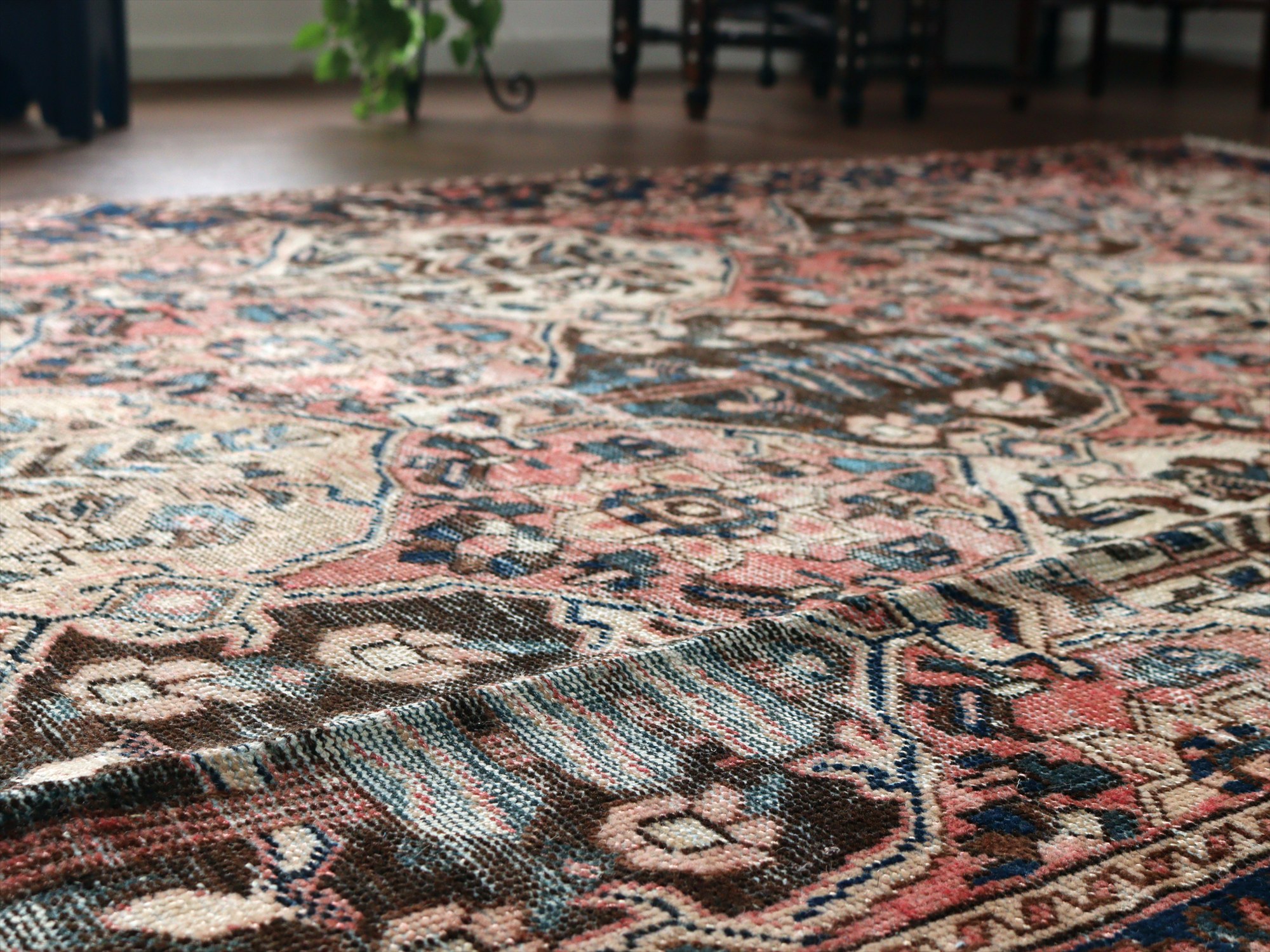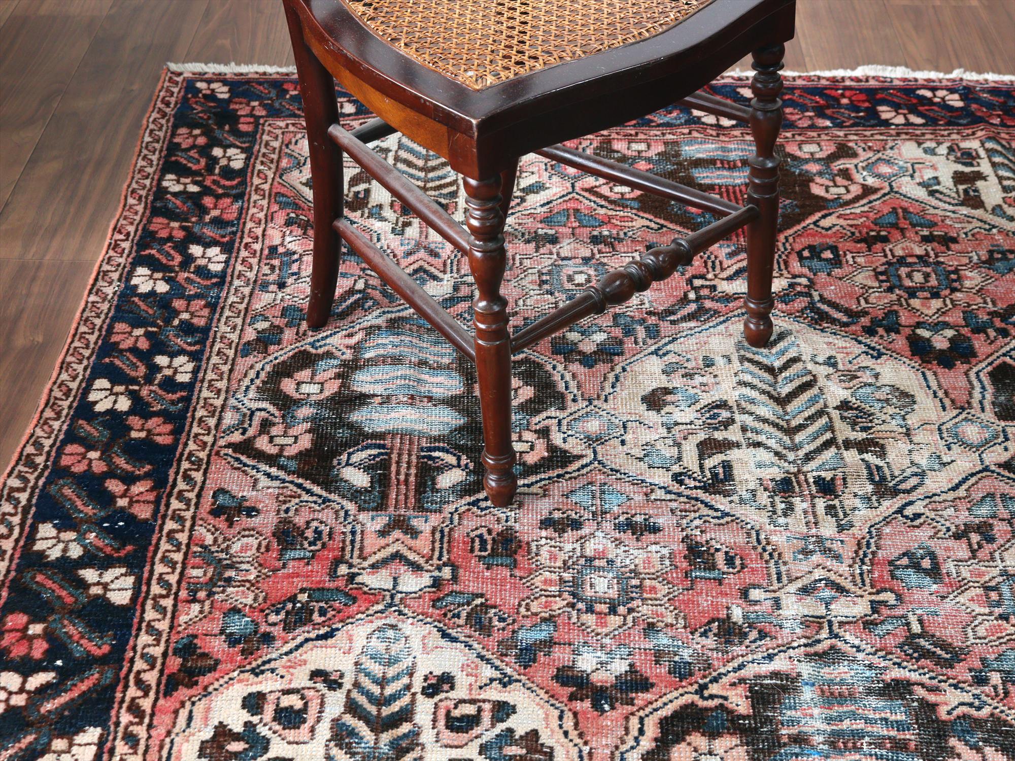 ダメージが多く、使われなくなった手織りカーペットを、洗った上でブリーチしたユーズドラグです。イチョウの葉のようなカタチのカルトゥーシュに、イトスギのある風景が織り込まれた、バクティアリ族の伝統柄です。