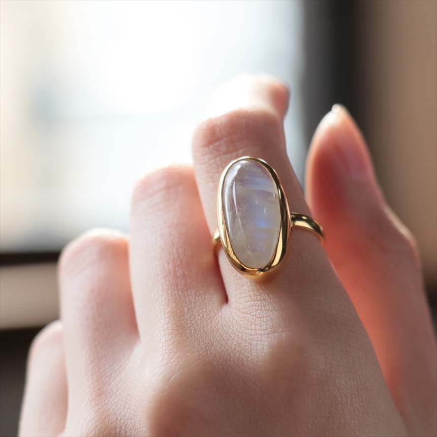幻想的で奥行のある輝きが魅力のレインボームーンストーンのリングです。角度を変えるたび、乳白色の石の中に鮮やかなブルーのシラーが浮かび上がります。ぷるんとした縦長のオーバルフォルムは、指をほっそりと長く見せてくれる嬉しい視覚効果があります。