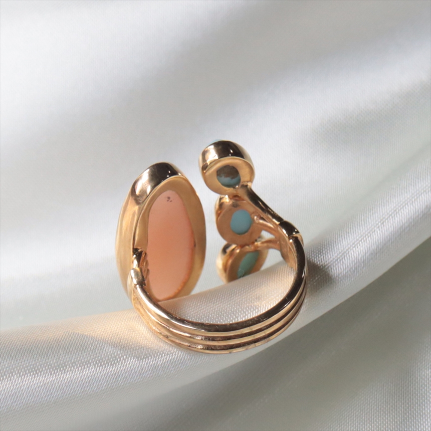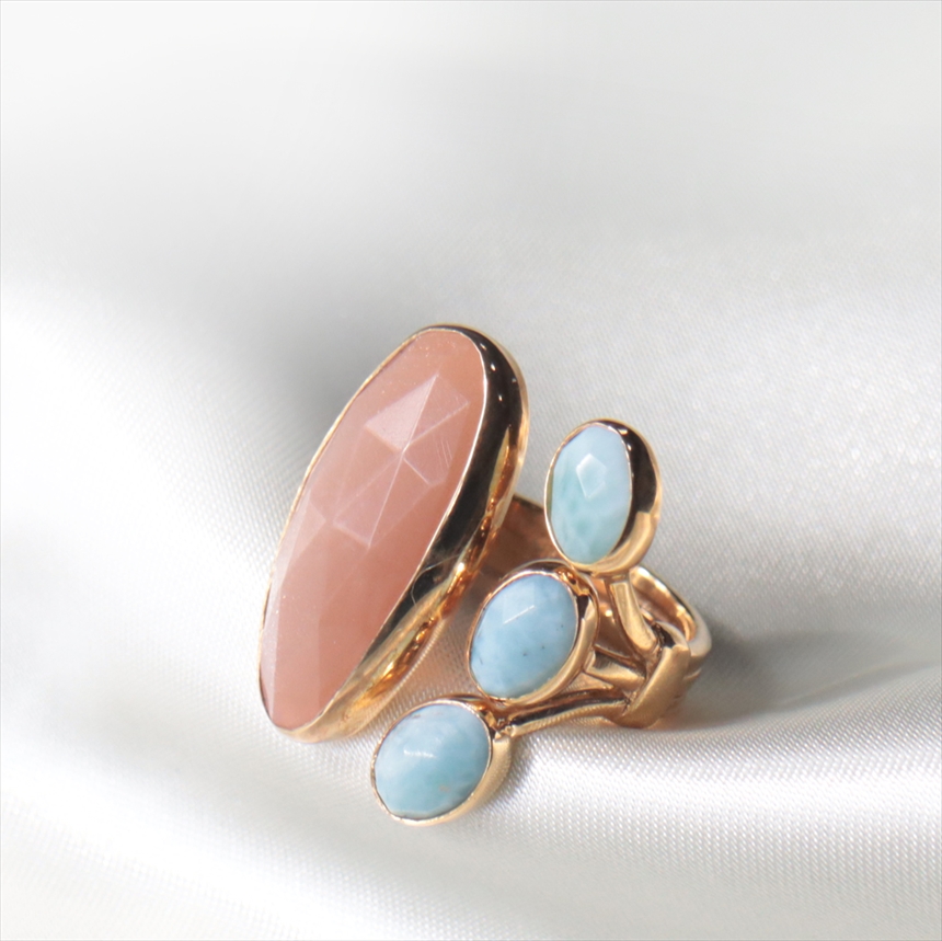 「太陽の石」サンストーンと、深い安らぎをもたらす「海の石」のラリマー。二つの石のコントラストが、身につける人の心を明るく穏やかに整えます。指のラインを美しく見せる縦長のシルエットの大きなサンストーンに対して、小ぶりなラリマーを3つ並べることで、重厚感と軽やかさが絶妙なバランスのデザインです。
