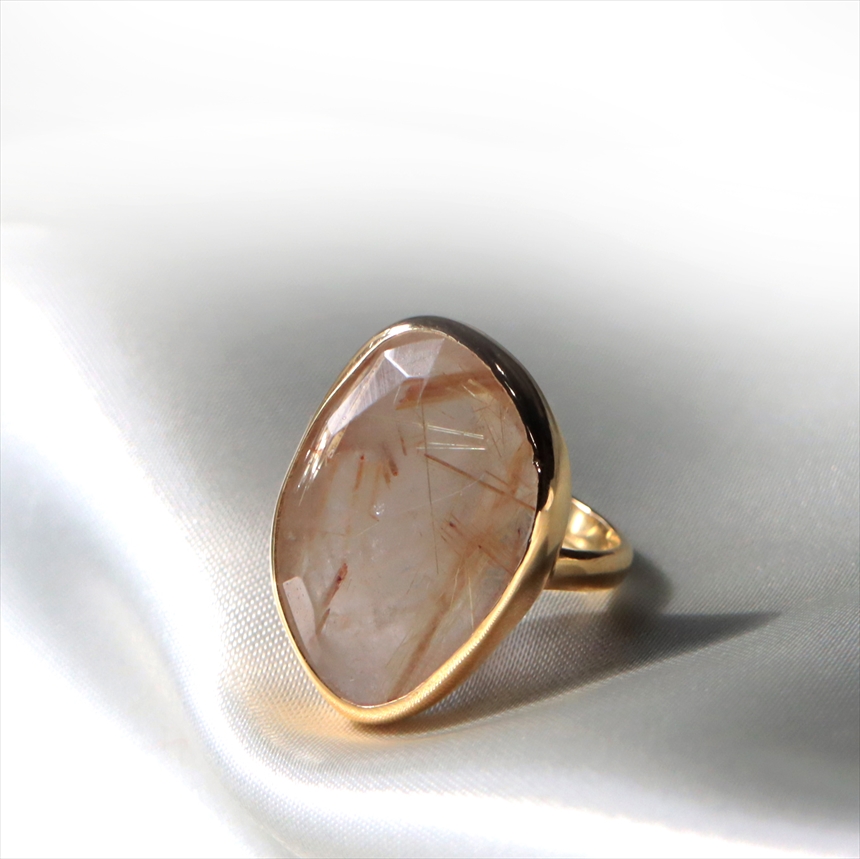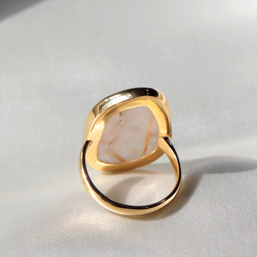 クリアなクォーツの中に繊細なゴールドの針(ルチル)が閉じ込められた、自然が生んだ神秘ともいえる、ルチルクォーツのリングです。肌に溶け込むヌーディーな色調にゴールドが煌めき、手元をより洗練された知的な印象にみせてくれます。