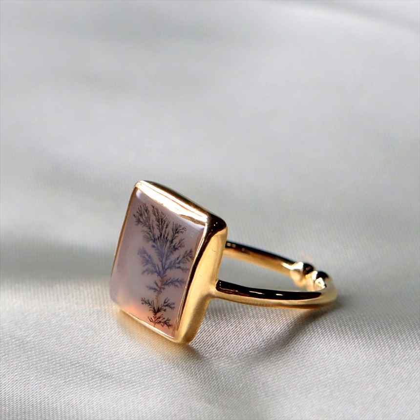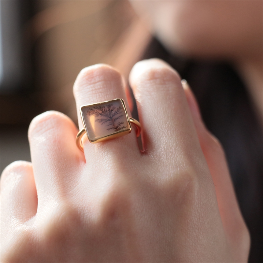 やわらかな乳白色の水晶の中にシダ植物のような模様(内包物)が広がるデンドライトのリングです。一粒ごとに異なる絵画のような天然石の表情が、手元を見るたびに深い癒やしを与えてくれます。