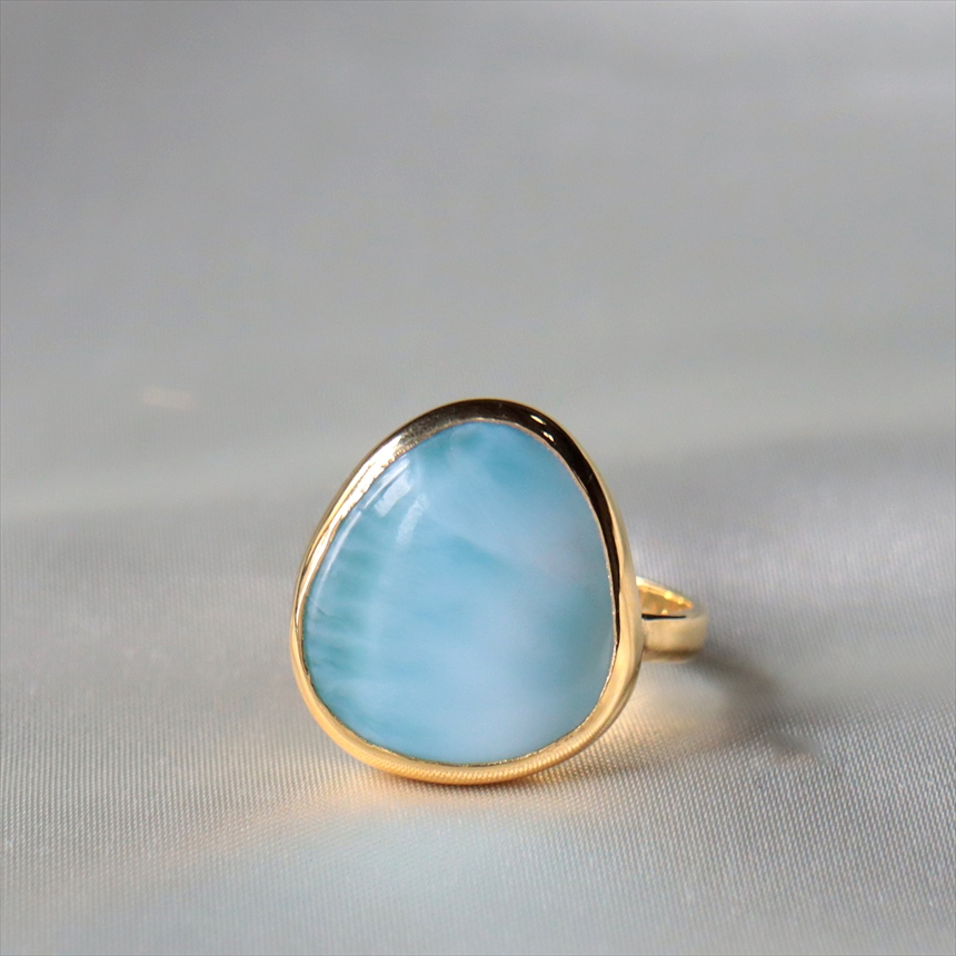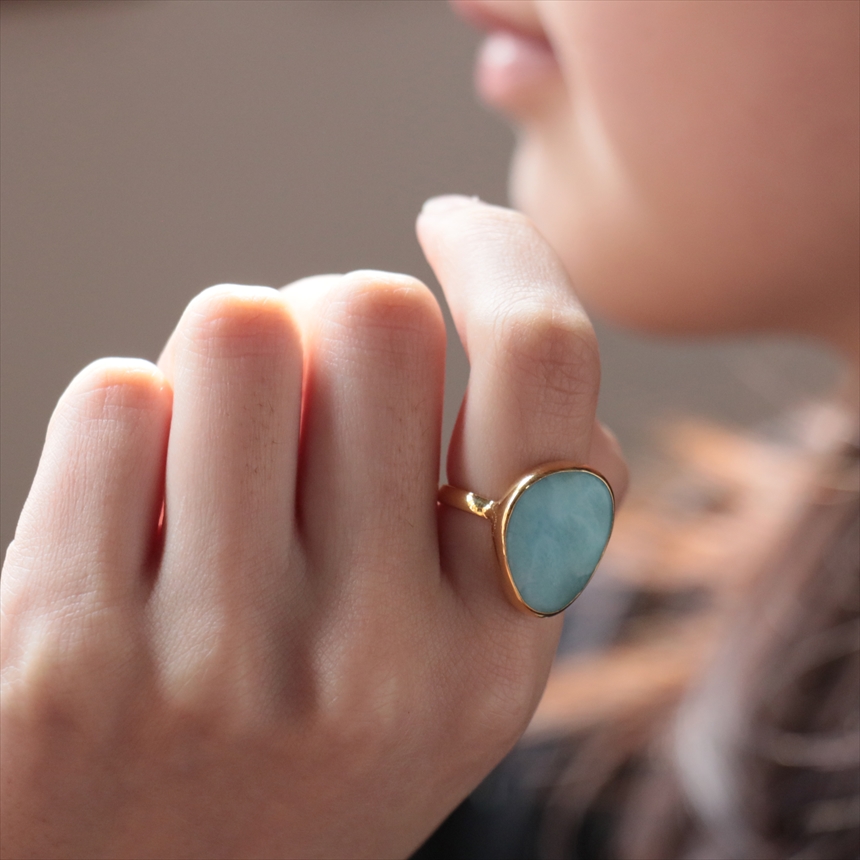 ラリマー特有の乳白色が混ざったブルーに、波模様が見えるリングです。丸みを帯びた、柔らかな三角形。この有機的なラインが、ラリマーの優しいブルーと相まって、手元に穏やかで上品な印象を与えます。