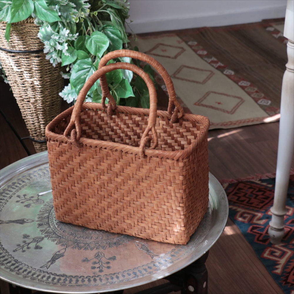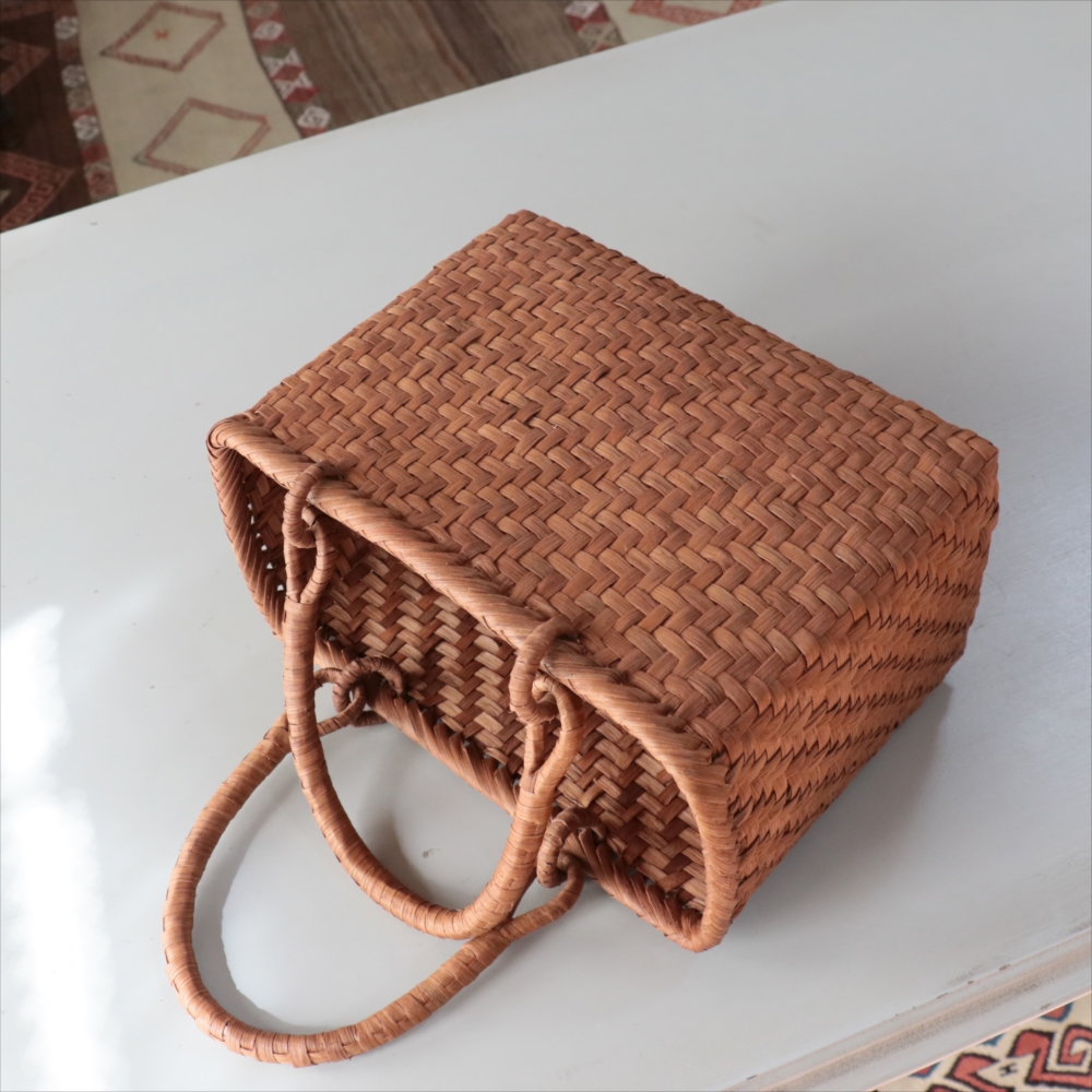 しっかりと厚みのある四角い箱のような形のかごバッグです。リング手は座って膝にのせた時などに折りたためて、持ち手がじゃまにならず使いやすいのでおすすめです。