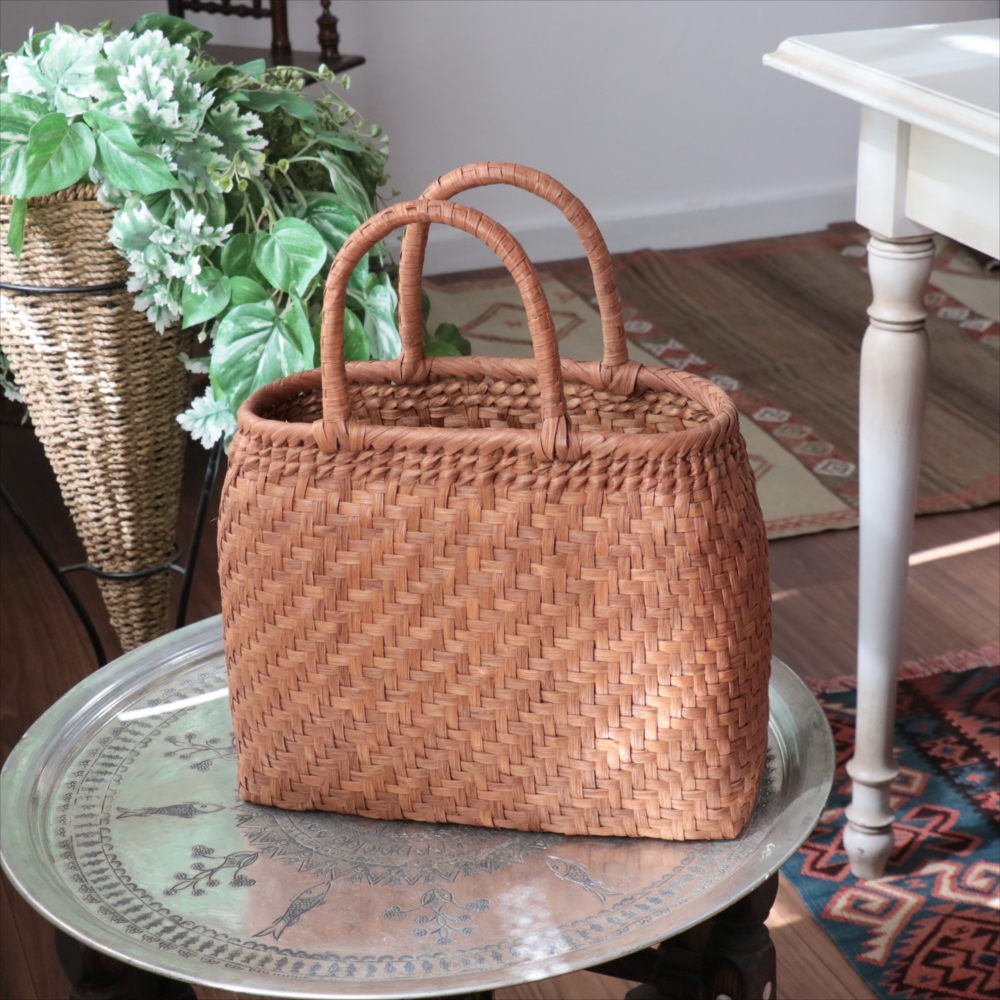 まるみのあるきれいなラインのカゴバッグ。シンプルな網代編みです。高さがあってマチも広めなので、普段使いに活躍できるかごバッグです。やまぶどうの蔓の表面を削って整え、滑らかに仕上げています。山ぶどうのかごバックは、最初は少し赤みのある明るい茶色で、使い込むほどに艶が出てこげ茶色の味わい深い質感に変わってゆきます。その変化もお楽しみください。