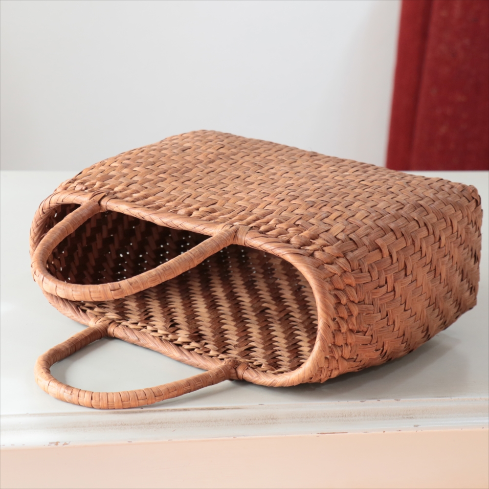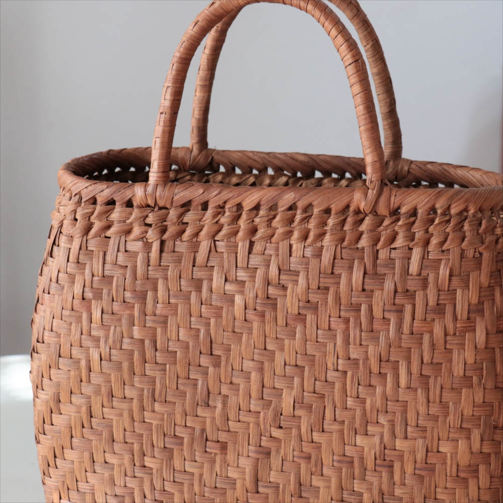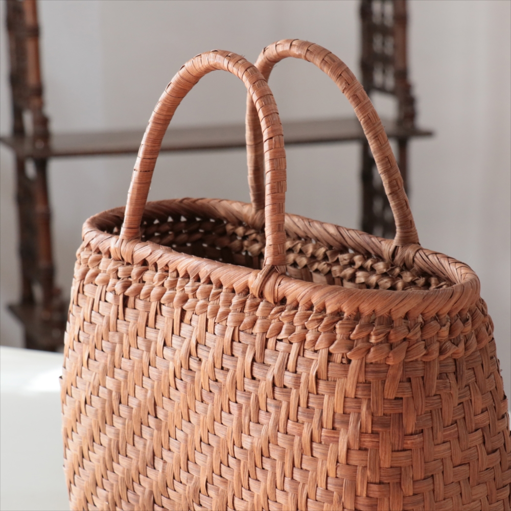 まるみのあるきれいなラインのカゴバッグ。シンプルな網代編みです。高さがあってマチも広めなので、普段使いに活躍できるかごバッグです。やまぶどうの蔓の表面を削って整え、滑らかに仕上げています。山ぶどうのかごバックは、最初は少し赤みのある明るい茶色で、使い込むほどに艶が出てこげ茶色の味わい深い質感に変わってゆきます。その変化もお楽しみください。