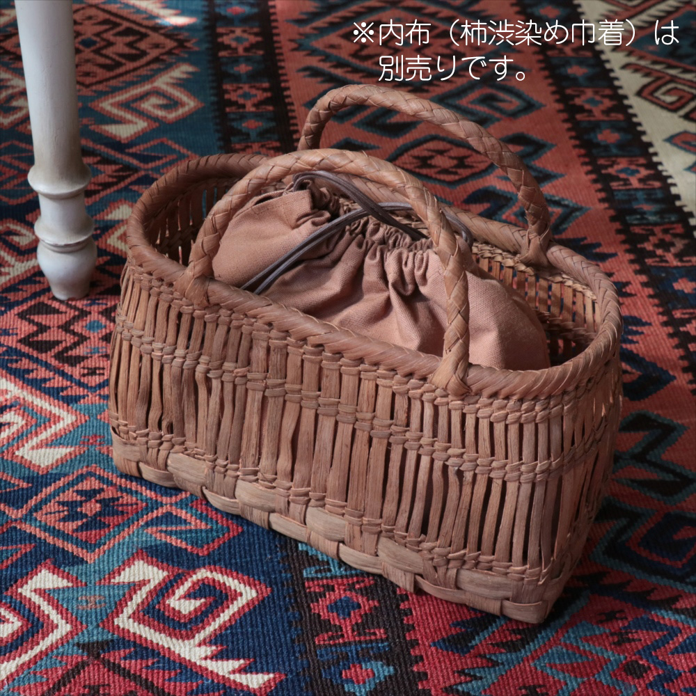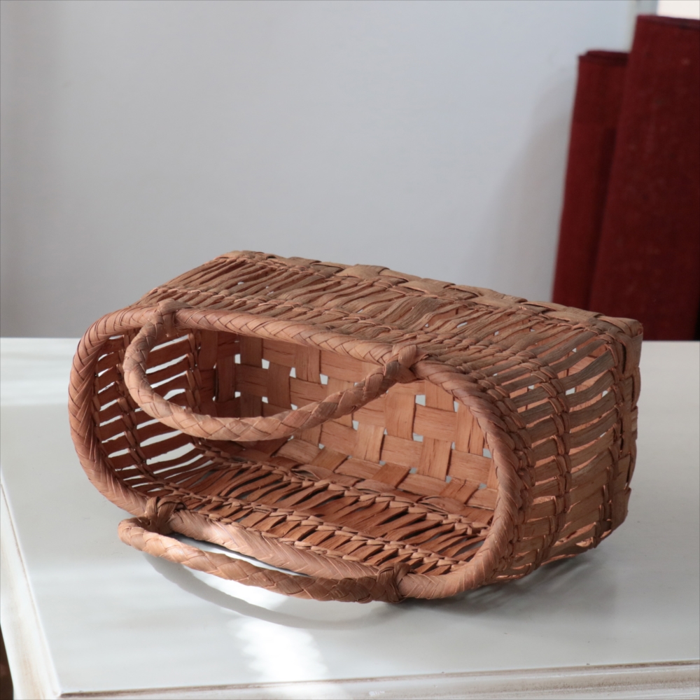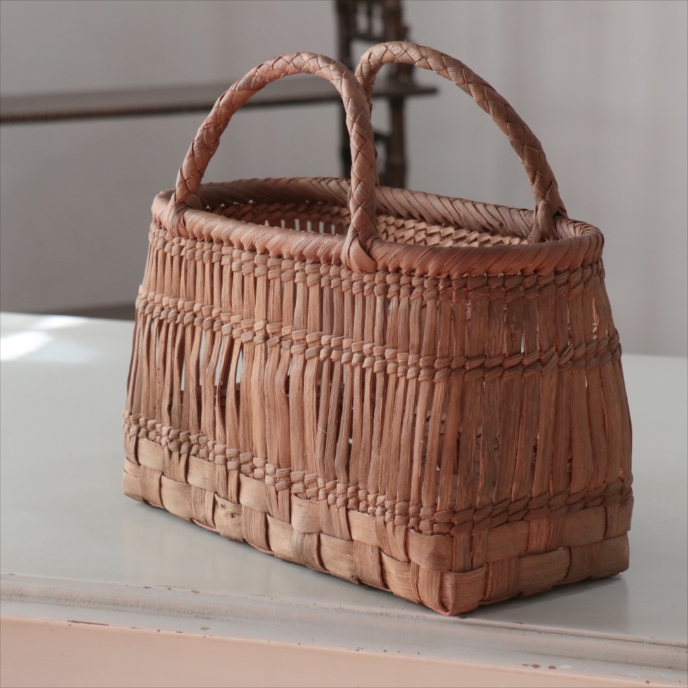 山葡萄の蔓の素材感が、存分に楽しめる透かし棚編みのかごバッグです。やまぶどうの蔓がちょっと曲がっているところや、節など、表情のゆたかな仕上がりです。