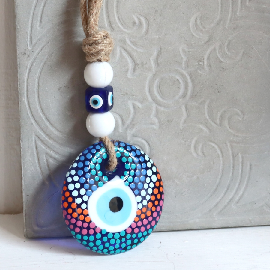 青いガラスがきれいなナザルボンジュウに、ハンドペイントでカラフルな絵付けをしてあります。イスタンブールのお土産でも大人気の個性的なナザルです。ドアや窓の近くなどに飾って、お楽しみください。