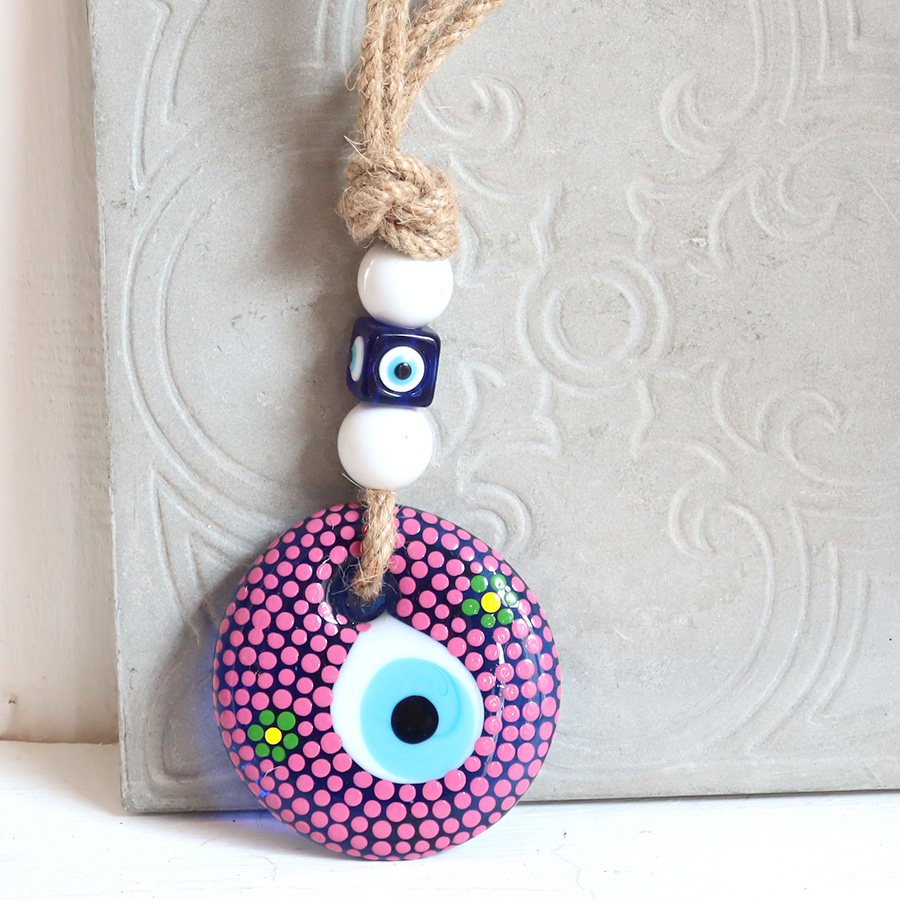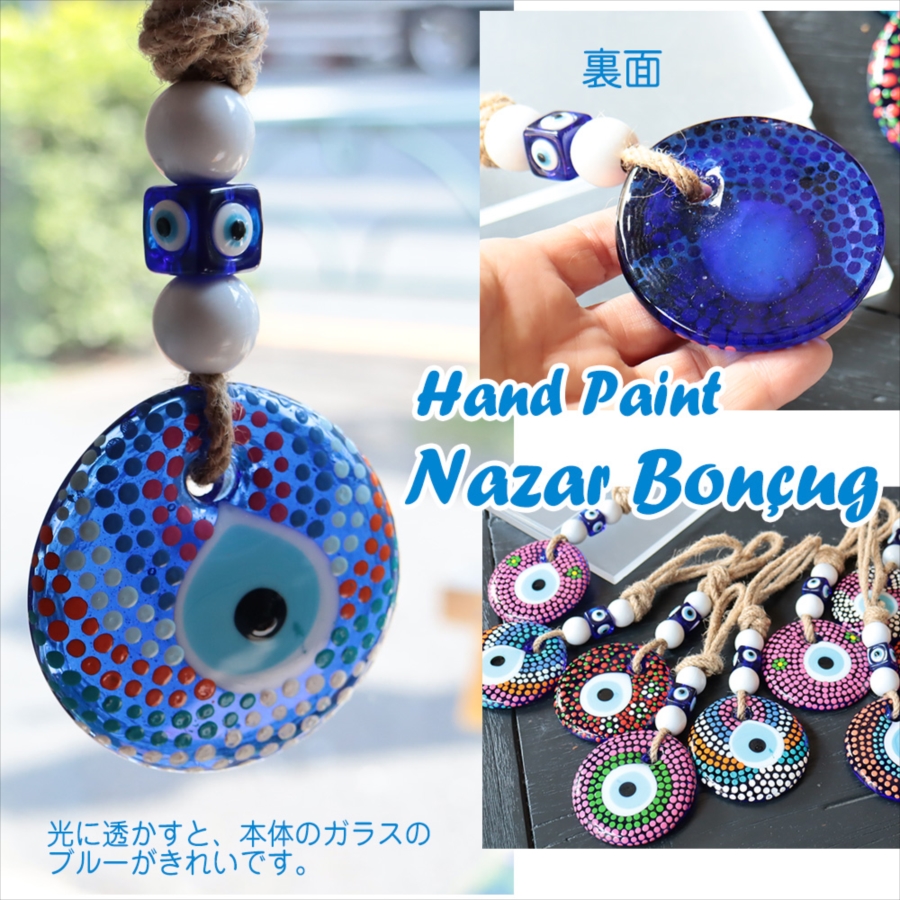 青いガラスがきれいなナザルボンジュウに、ハンドペイントでカラフルな絵付けをしてあります。イスタンブールのお土産でも大人気の個性的なナザルです。ドアや窓の近くなどに飾って、お楽しみください。