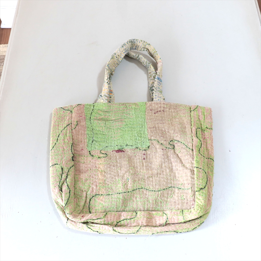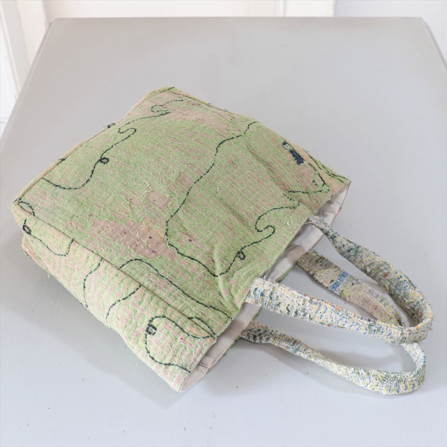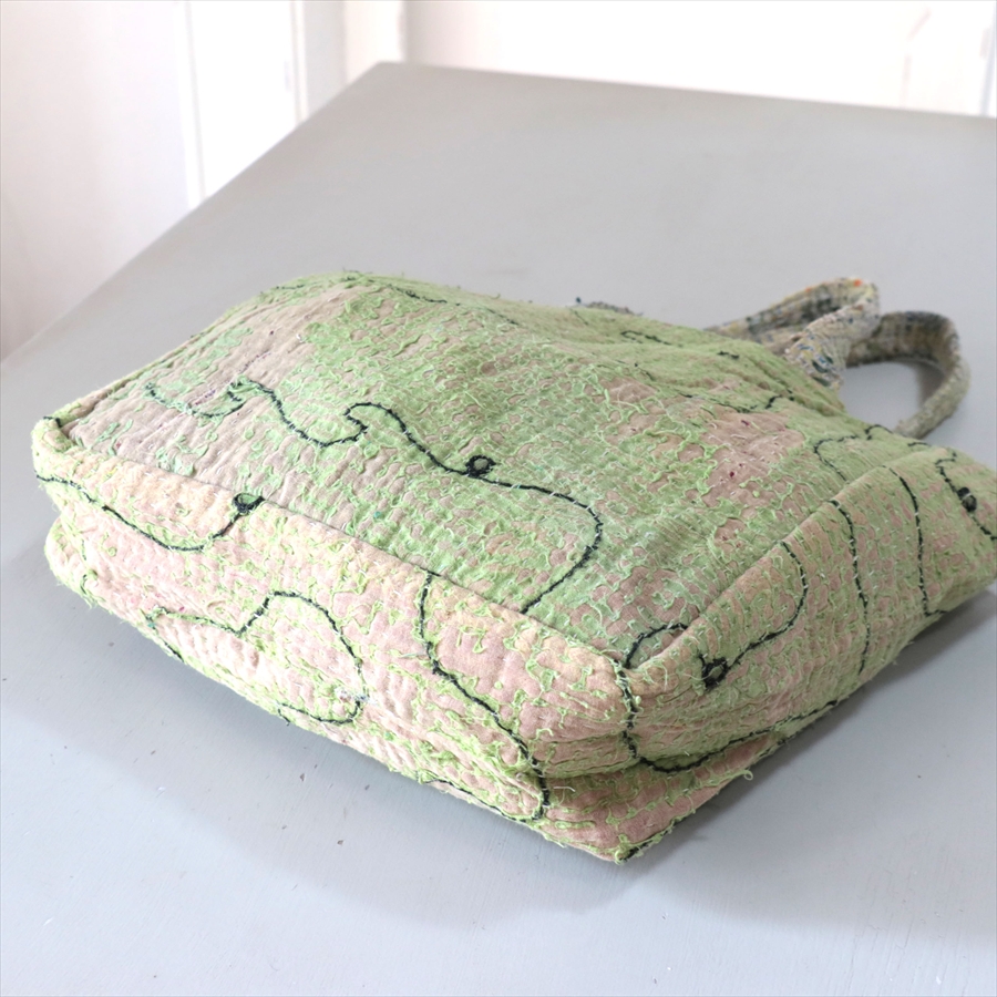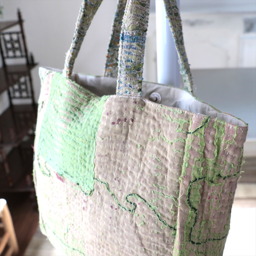 使い古された民族衣装のサリーやドゥパタを重ねて、刺し子刺繍をした伝統的な手仕事の布を使っています。表面のコットンは擦り切れているところもあるほど使い込まれていて、ヴィンテージ感たっぷり。コットンのやわらかな肌触りが心地よく、普段使いのバッグとして活躍してくれそうです。
