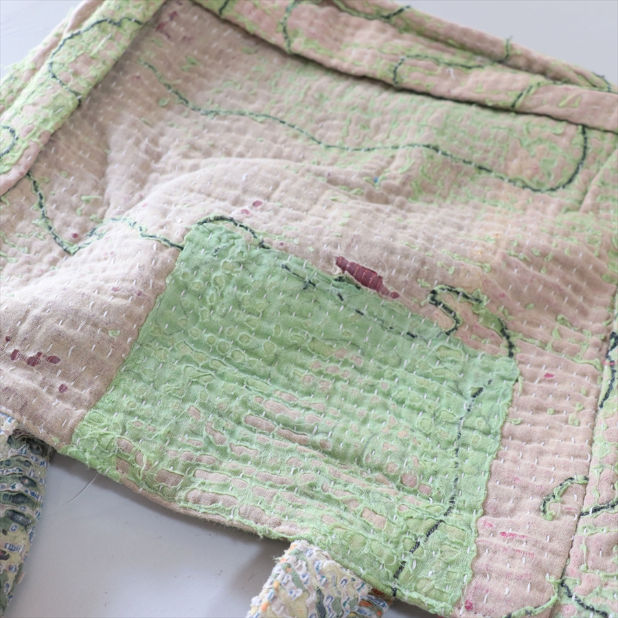 【カンタ刺繍 Kantha】インドベンガル地方などで古くから家庭で使うために作られてきた手刺繍の布。使い古した衣装などを重ね合わせて刺し子刺繍を施して補強したリサイクルの古布は、モノを大切に使い続ける工夫があふれ、ユニークなテクスチャが注目されています。