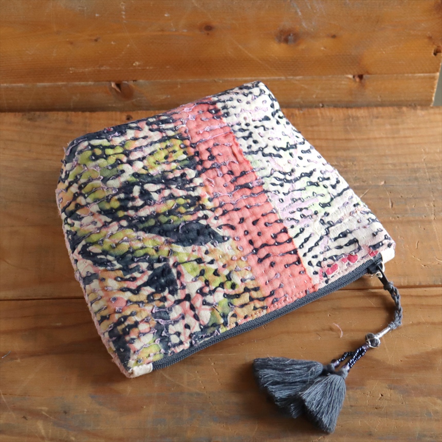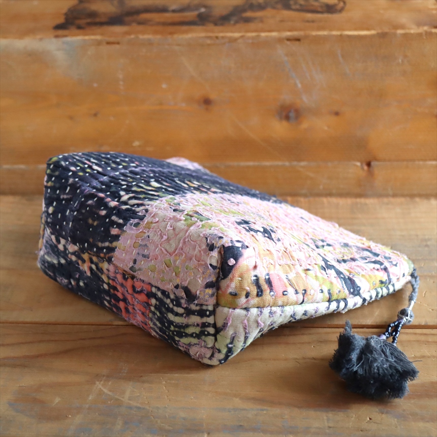 - ヴィンテージカンタ マチ付きポーチ カンタ刺繍 タッセル付き ラリーキルト インド 古布