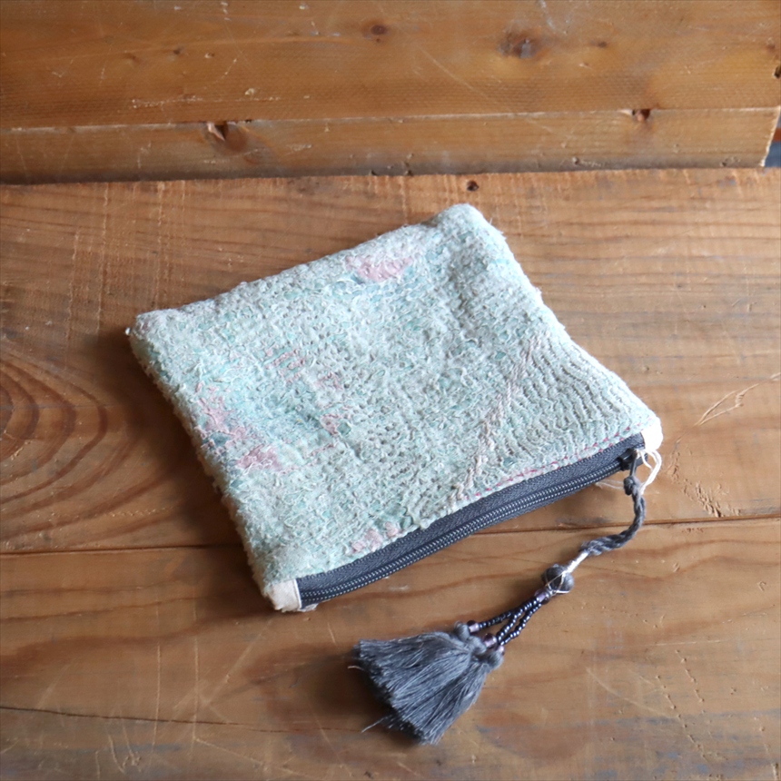 - ヴィンテージカンタ フラットポーチ カンタ刺繍 タッセル付きラリーキルト 現品 グレー系
