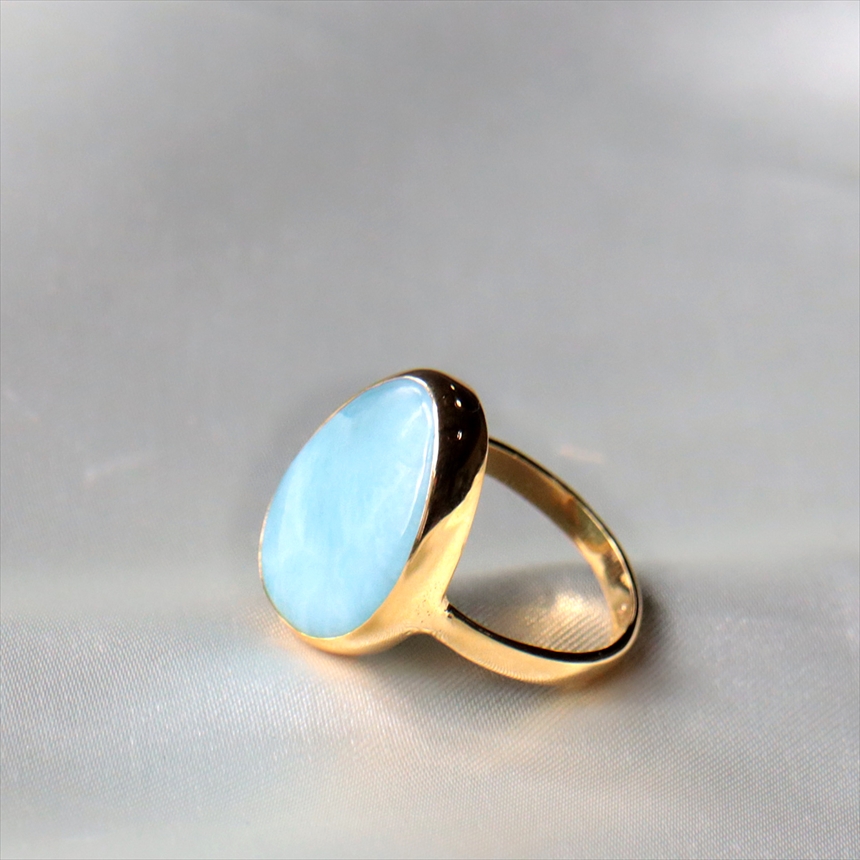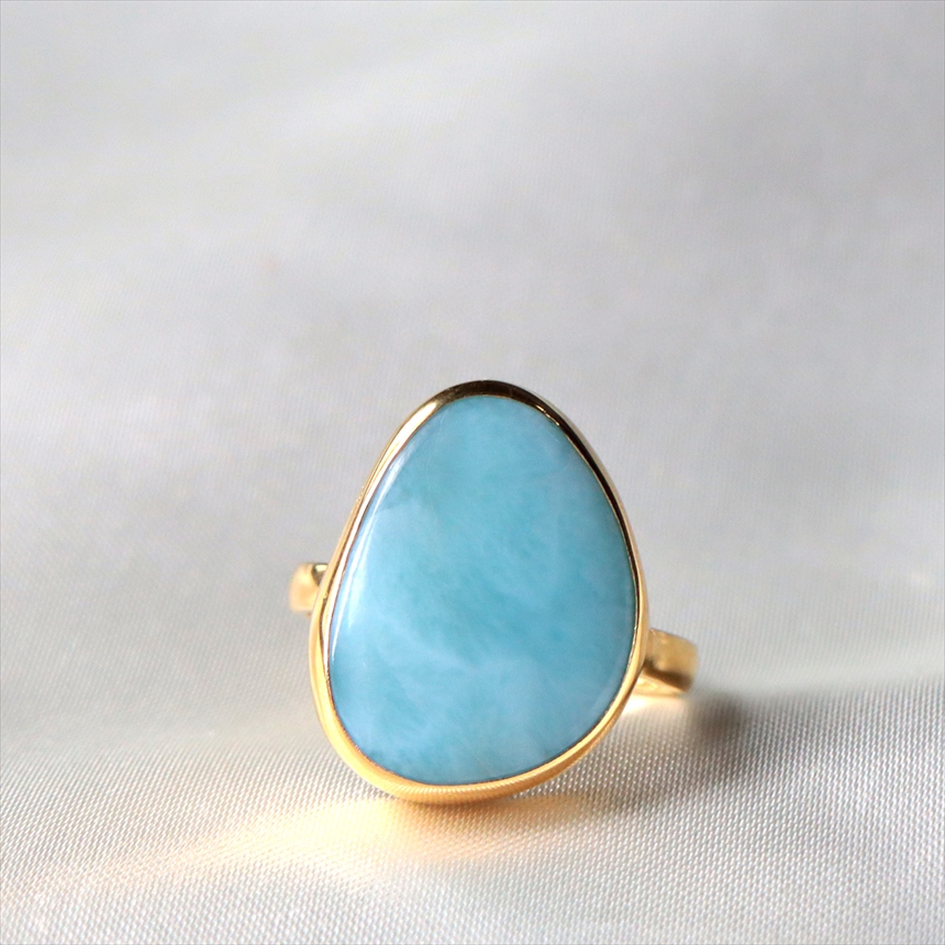 ラリマー特有の乳白色が混ざったブルーに、波模様が見えるリングです。丸みを帯びた、柔らかな三角形。この有機的なラインが、ラリマーの優しいブルーと相まって、手元に穏やかで上品な印象を与えます。