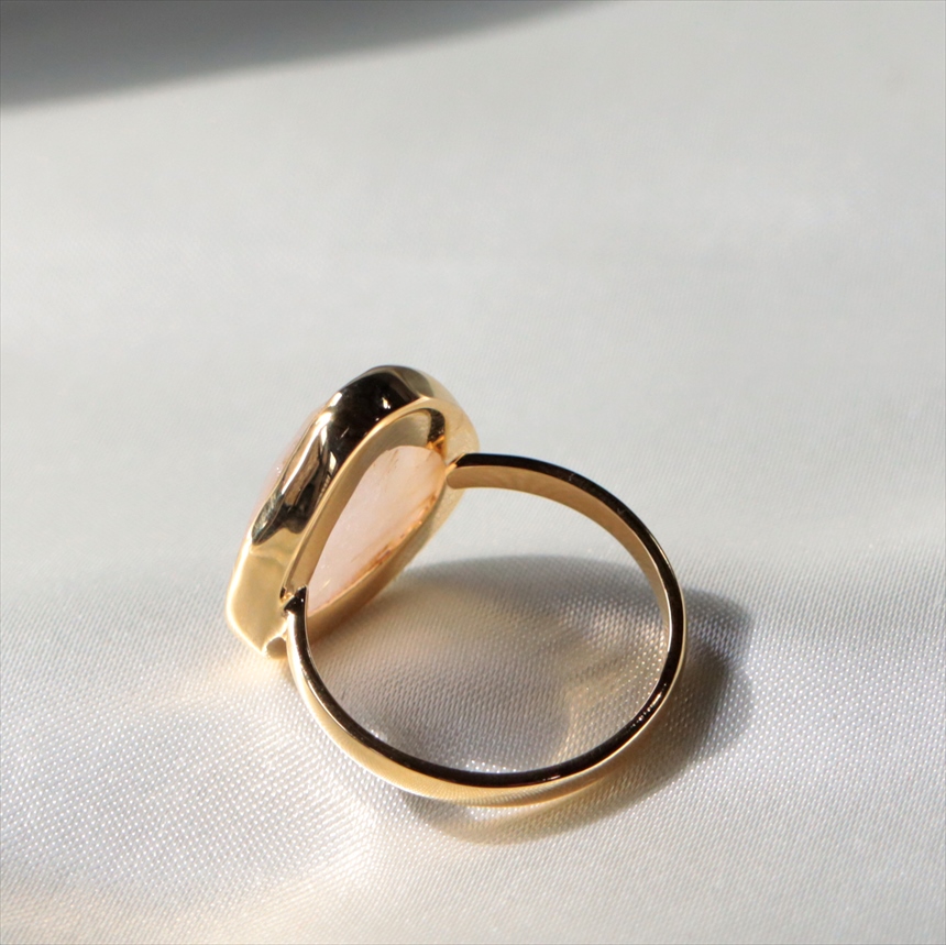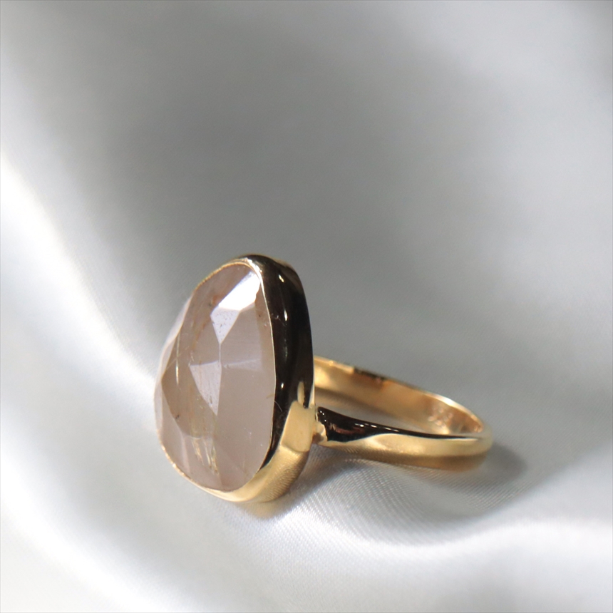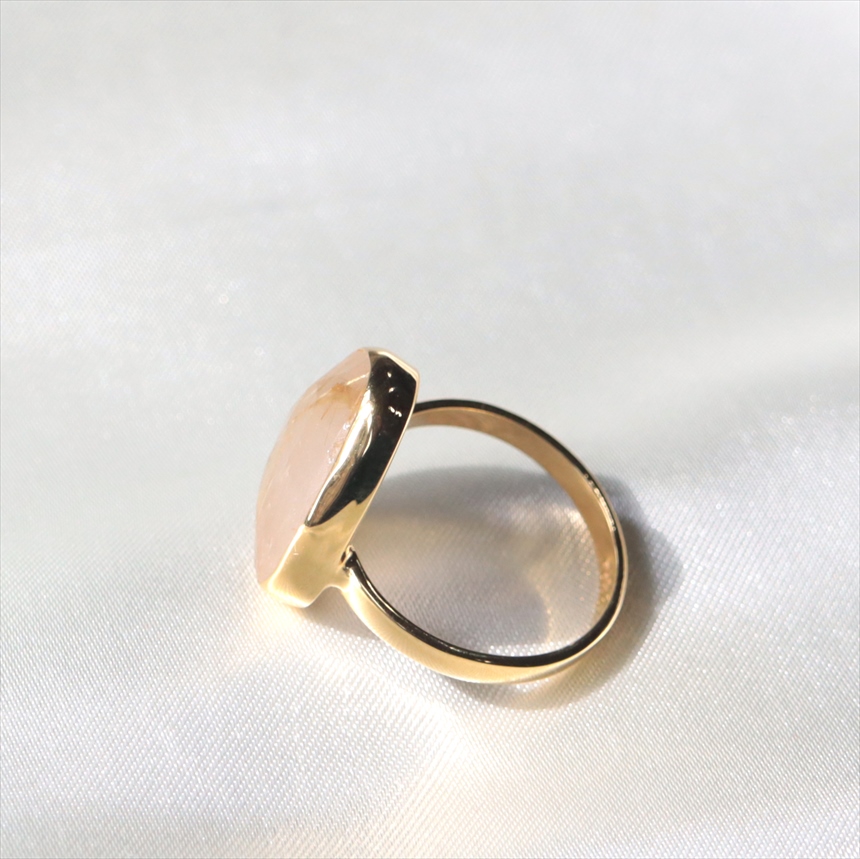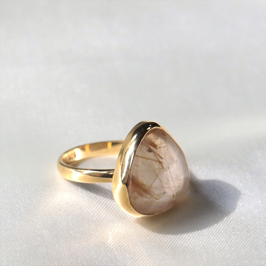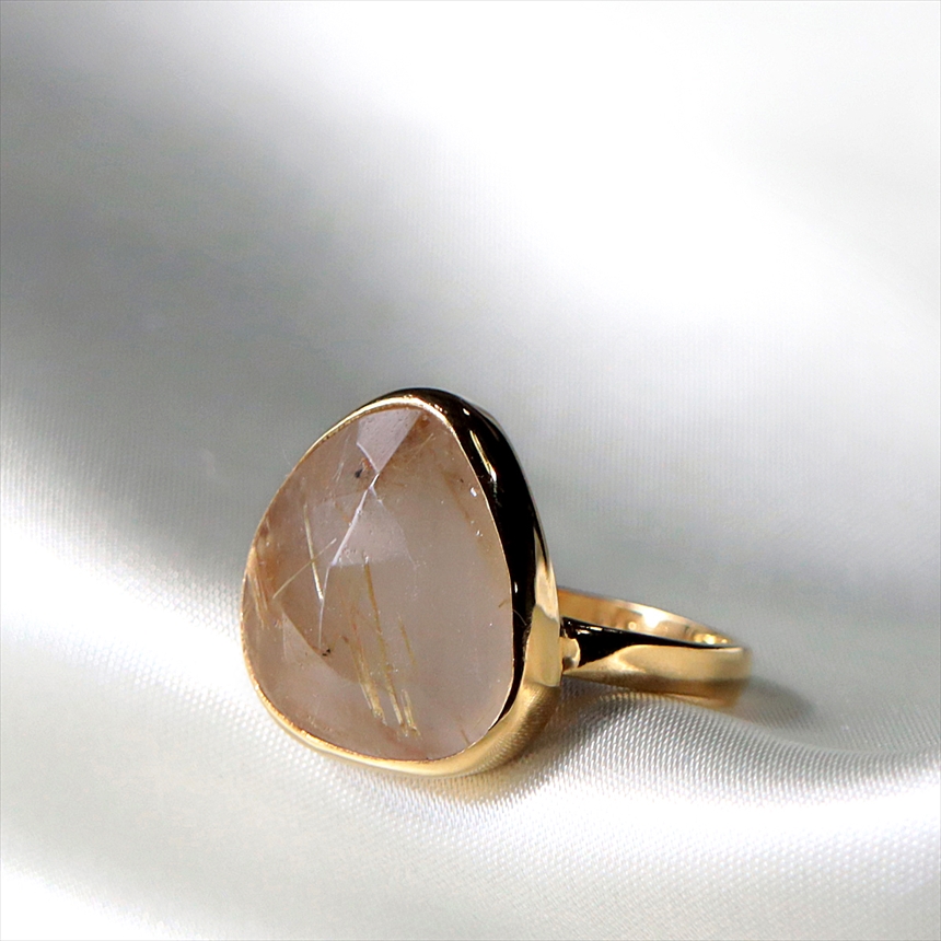 クリアなクォーツの中に繊細なゴールドの針(ルチル)が閉じ込められた、自然が生んだ神秘ともいえる、ルチルクォーツのリングです。肌に溶け込むヌーディーな色調にゴールドが煌めき、手元をより洗練された知的な印象にみせてくれます。