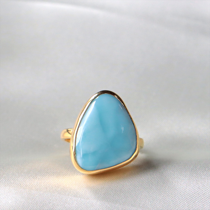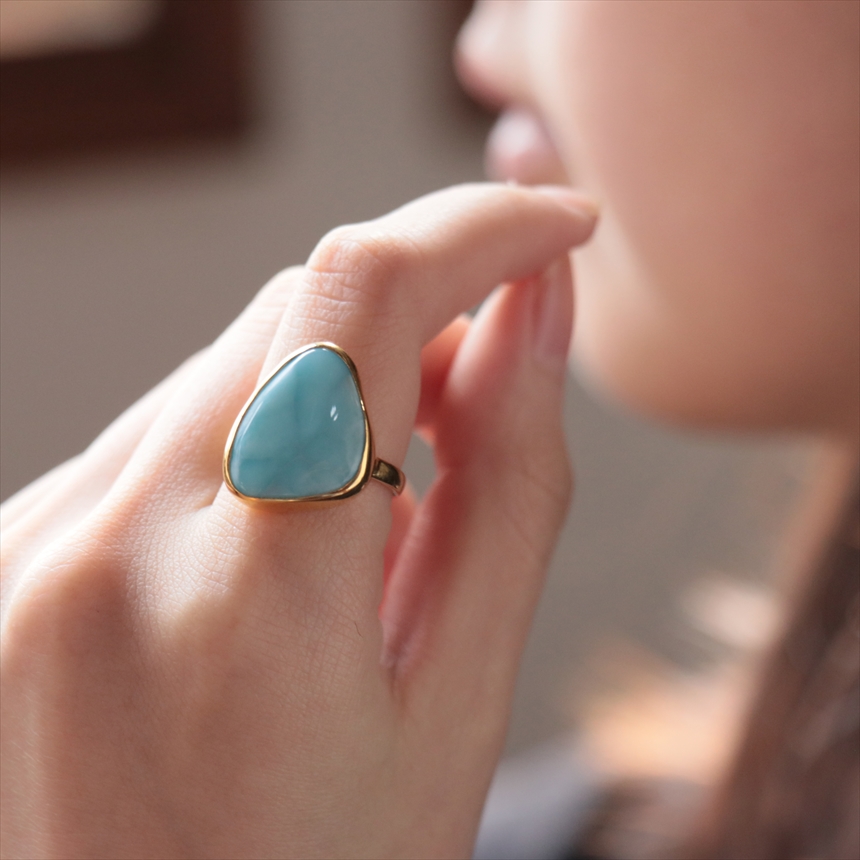 ラリマー特有の乳白色が混ざったブルーに、波模様が見えるリングです。丸みを帯びた、柔らかな三角形。この有機的なラインが、ラリマーの優しいブルーと相まって、手元に穏やかで上品な印象を与えます。