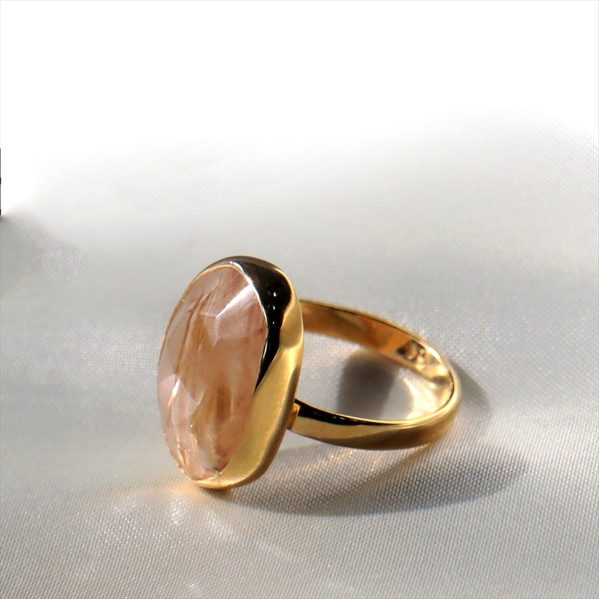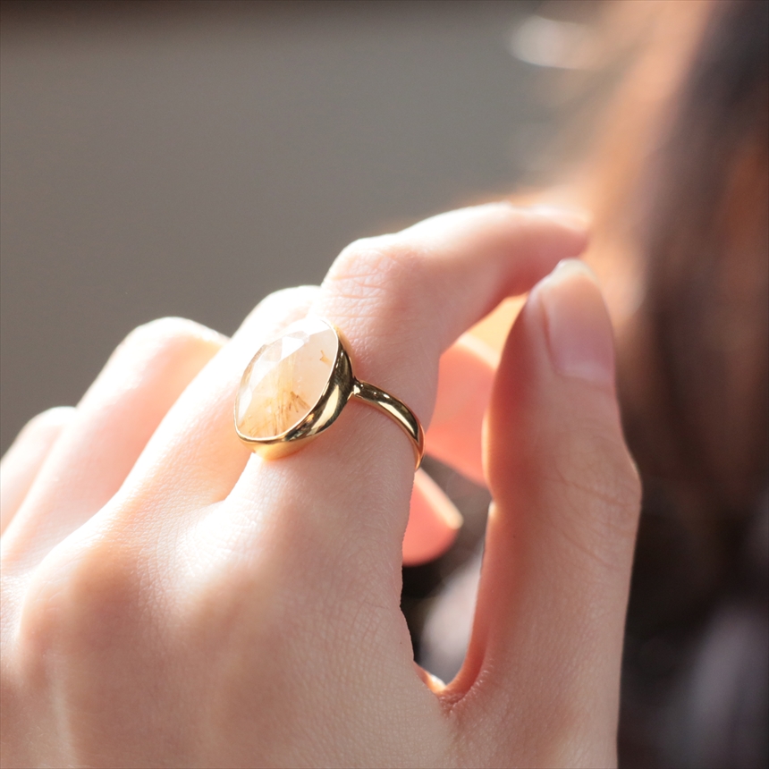クリアなクォーツの中に繊細なゴールドの針(ルチル)が閉じ込められた、自然が生んだ神秘ともいえる、ルチルクォーツのリングです。肌に溶け込むヌーディーな色調にゴールドが煌めき、手元をより洗練された知的な印象にみせてくれます。