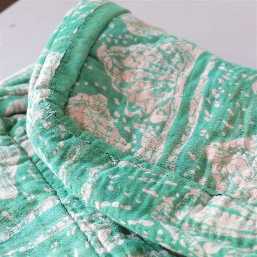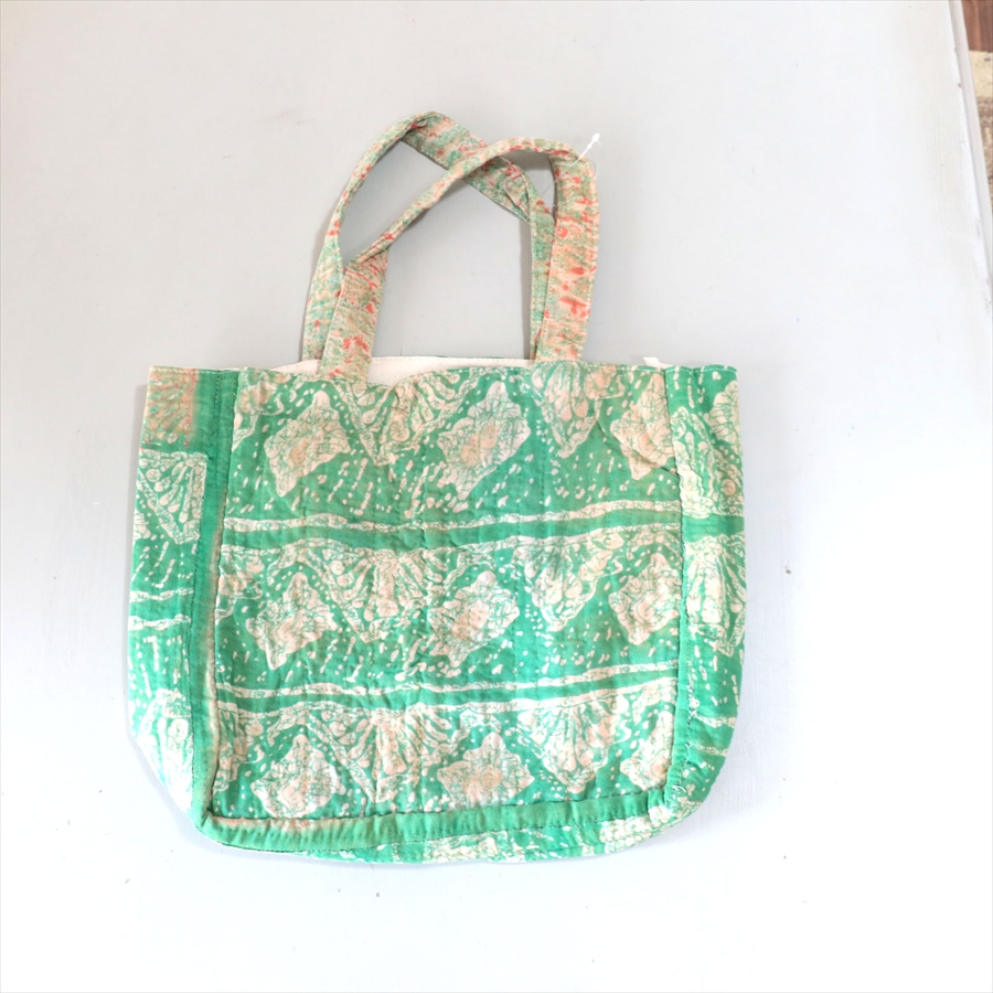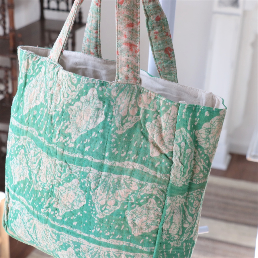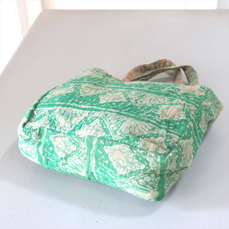 使い古された民族衣装のサリーやドゥパタを重ねて、刺し子刺繍をした伝統的な手仕事の布を使っています。表面のコットンは擦り切れているところもあるほど使い込まれていて、ヴィンテージ感たっぷり。コットンのやわらかな肌触りが心地よく、普段使いのバッグとして活躍してくれそうです。