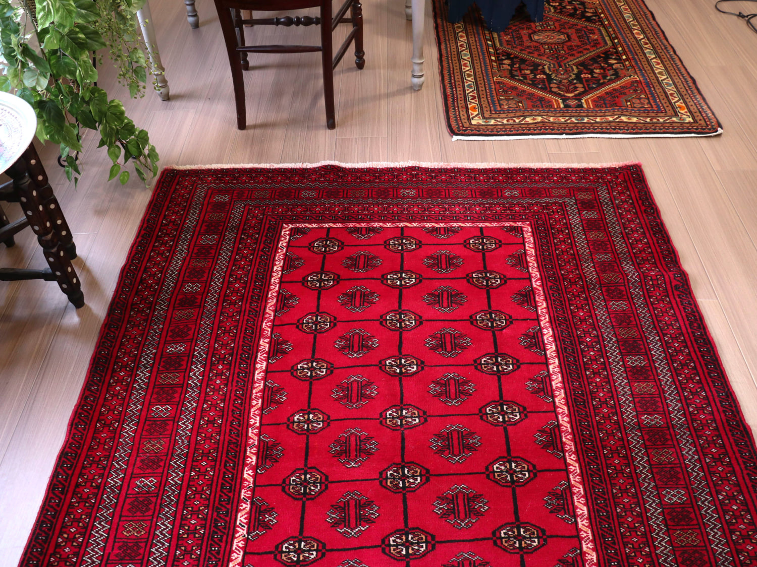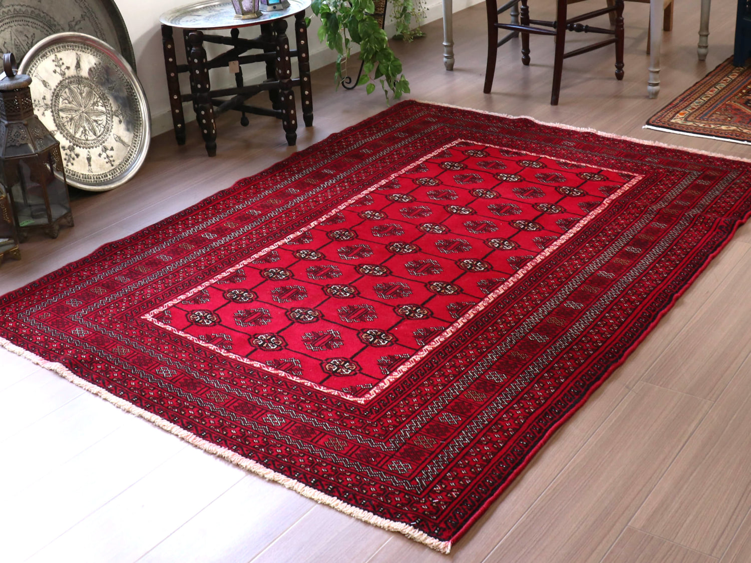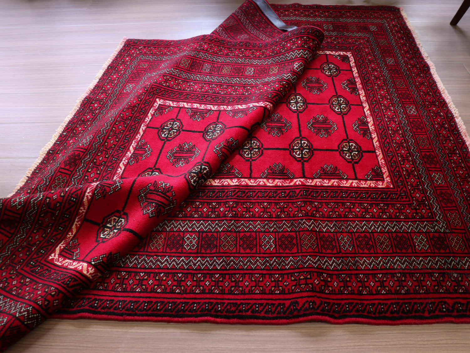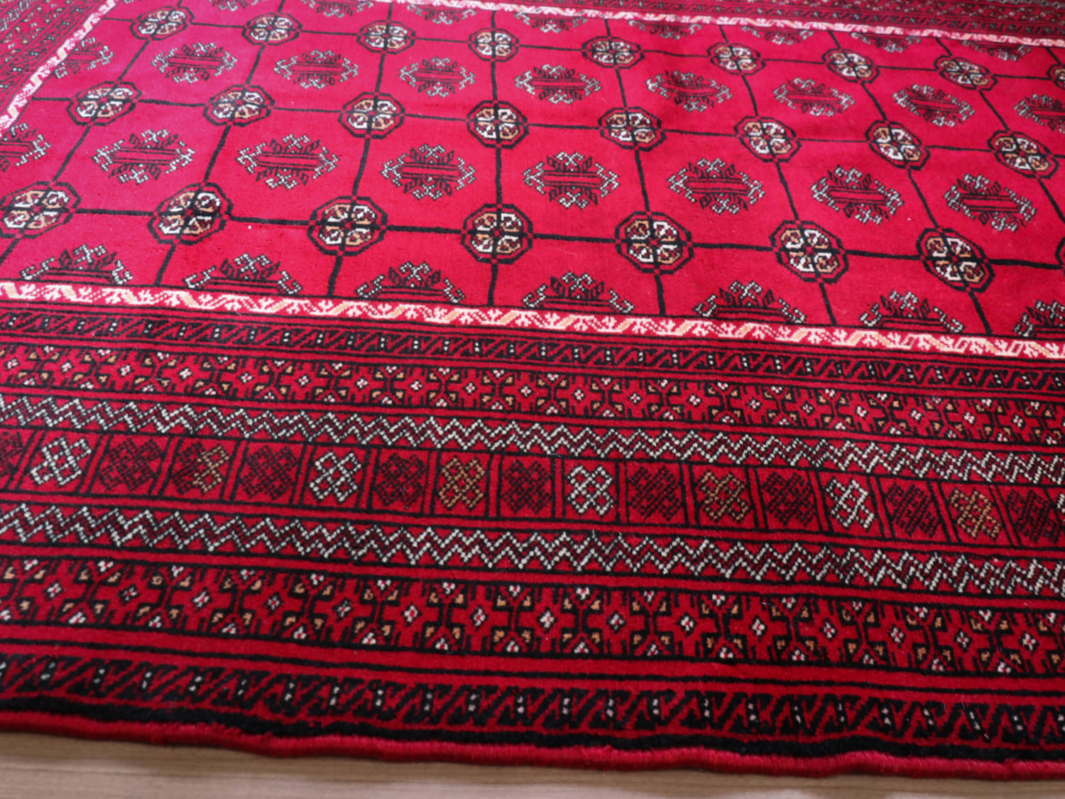 中央アジアからアフガン・パキスタンなどに住むトルクメン族のカーペット。ギュルと呼ばれる文様が連なる伝統的なデザインです。横幅が広い長方形で、使いやすい一枚。赤の色はずっしりと重たい感じではなく、わずかにピンクがかった明るめの色です。