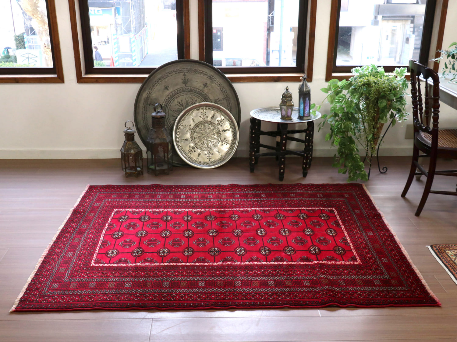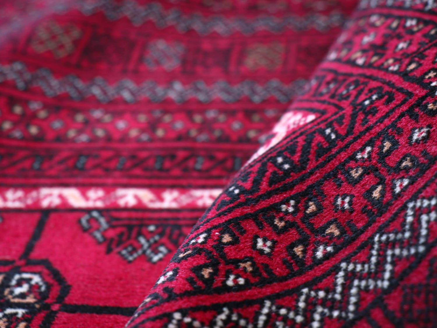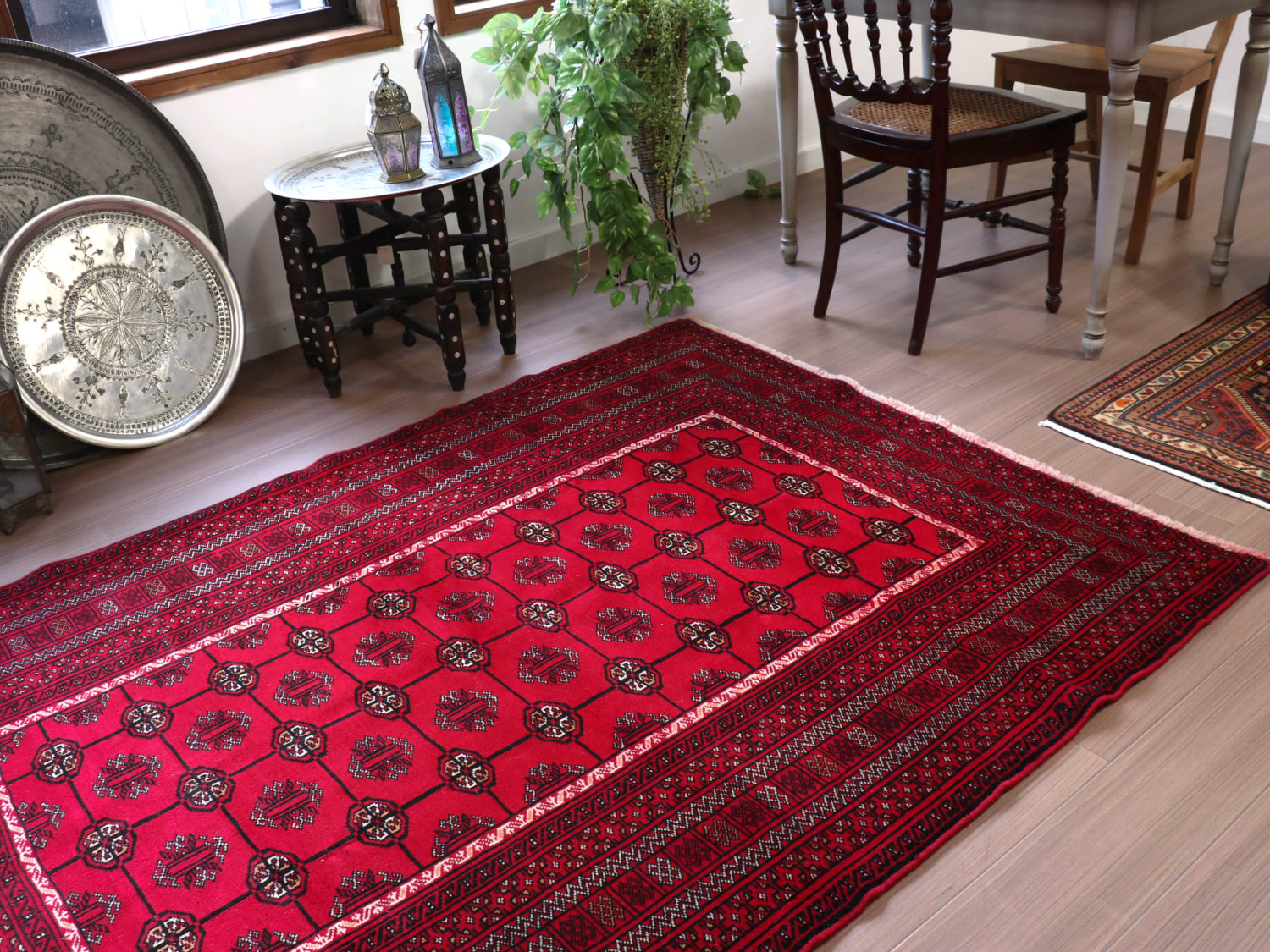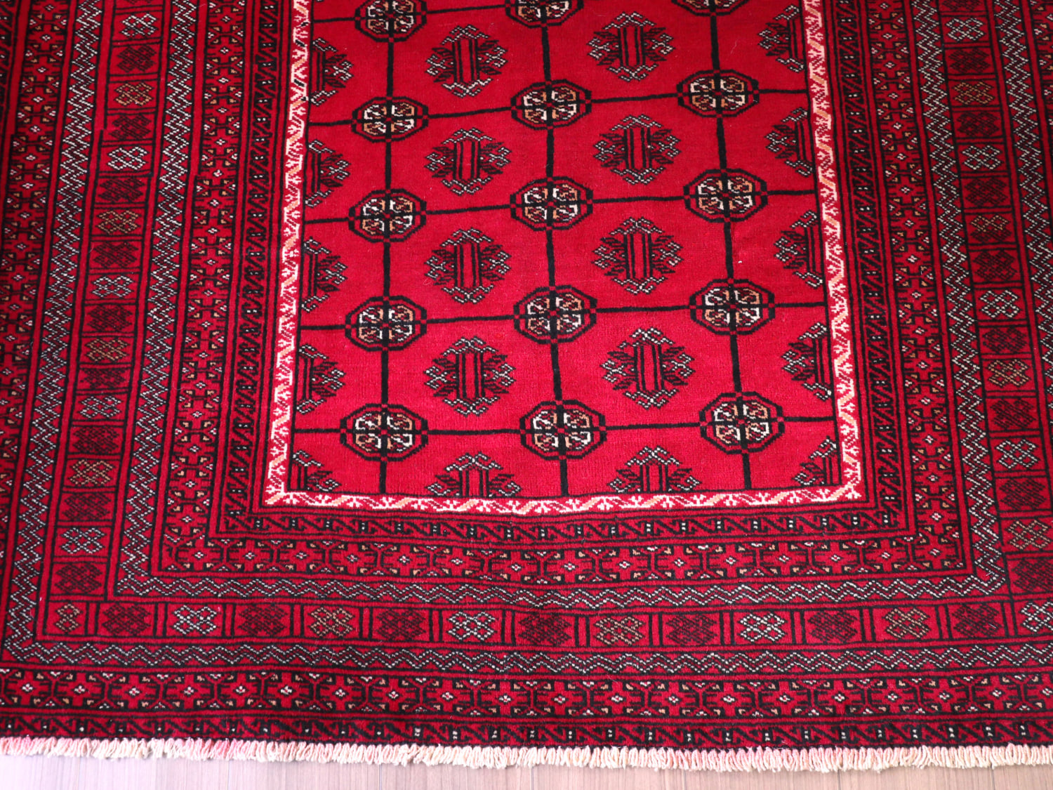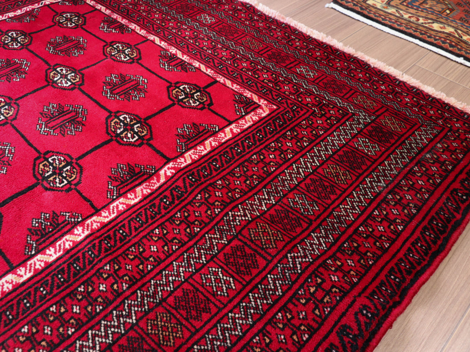 中央アジアからアフガン・パキスタンなどに住むトルクメン族のカーペット。ギュルと呼ばれる文様が連なる伝統的なデザインです。横幅が広い長方形で、使いやすい一枚。赤の色はずっしりと重たい感じではなく、わずかにピンクがかった明るめの色です。