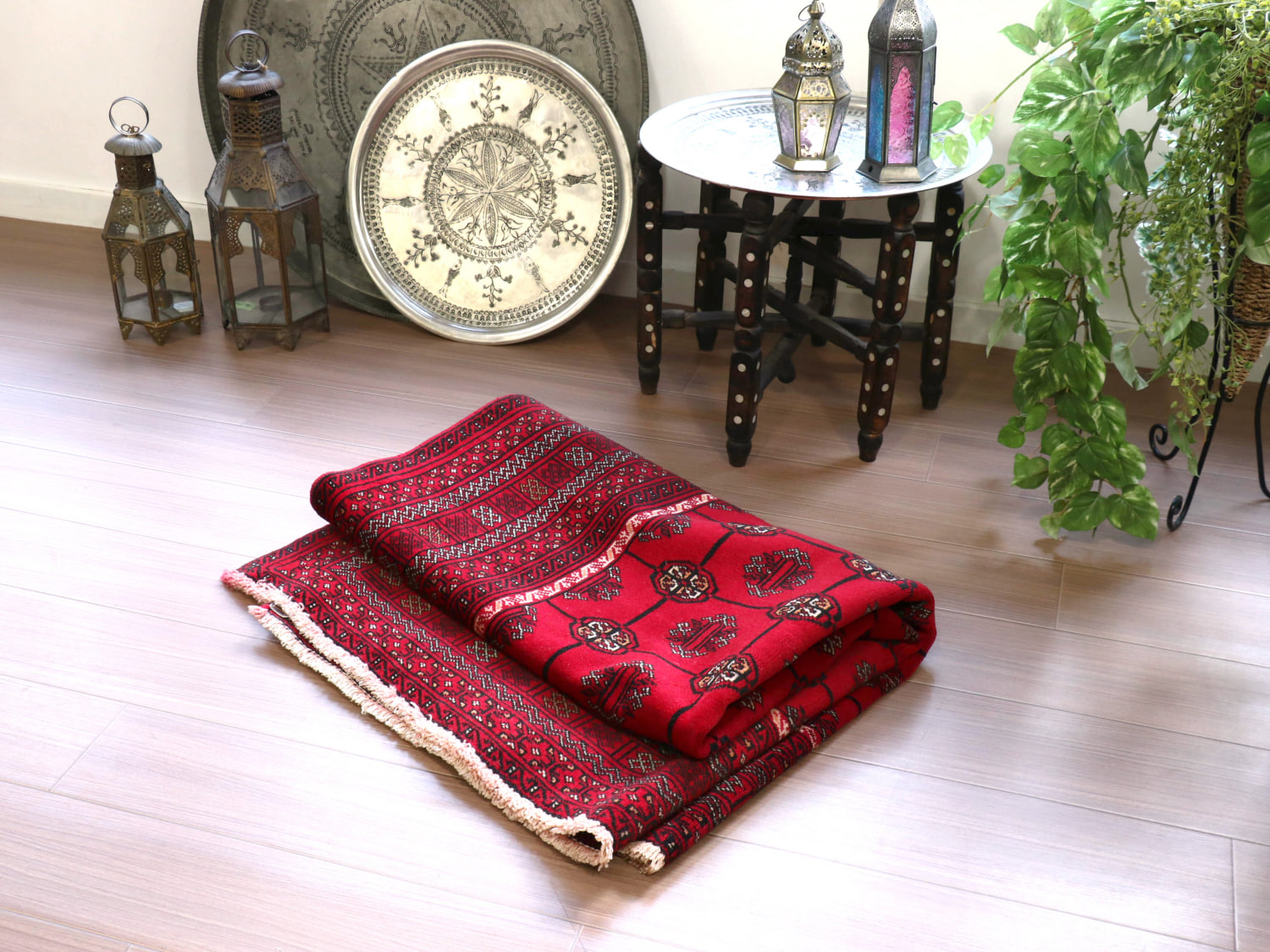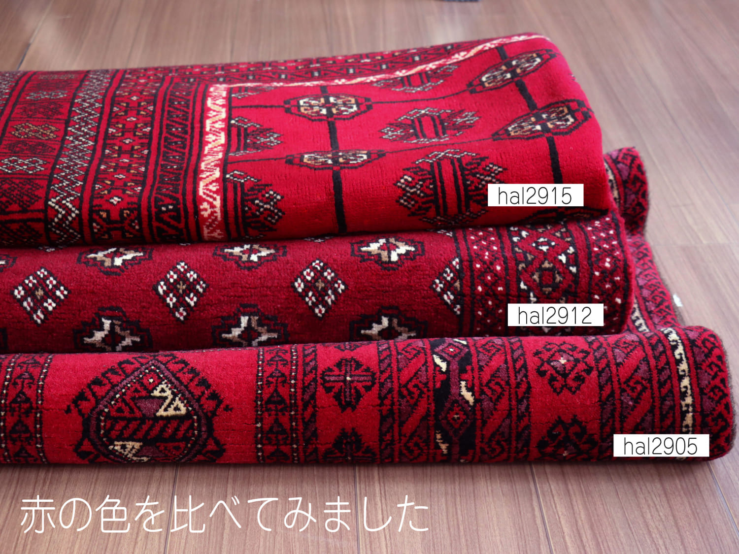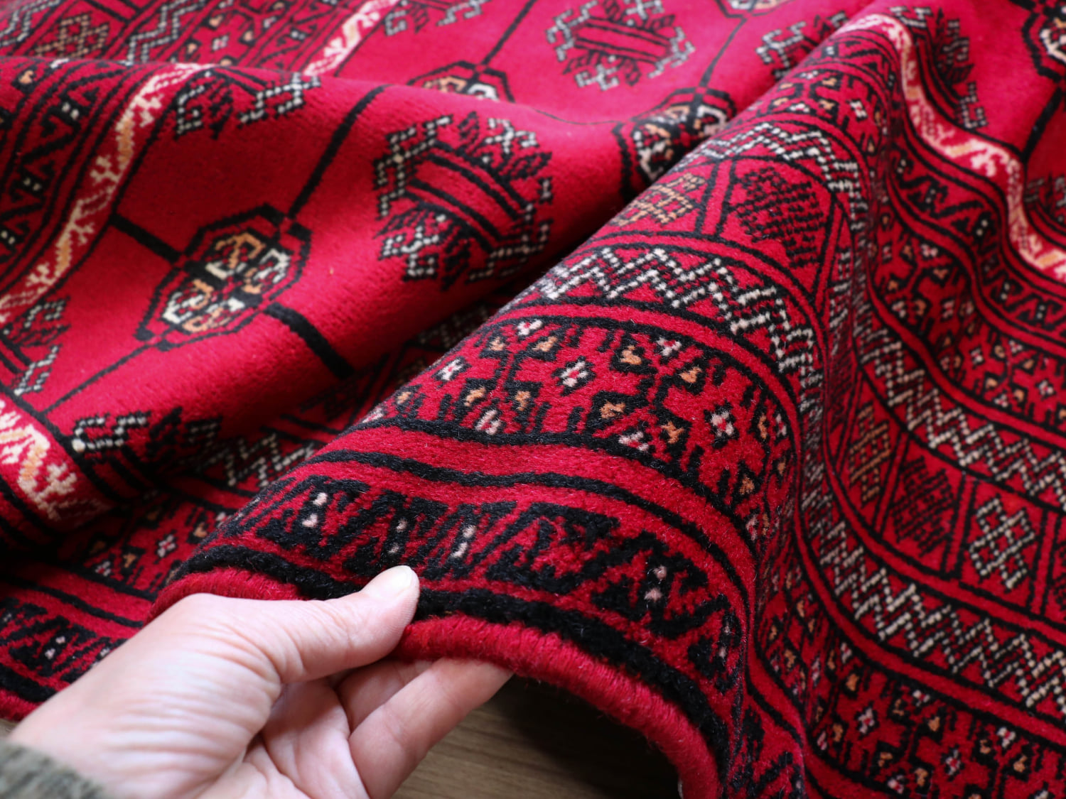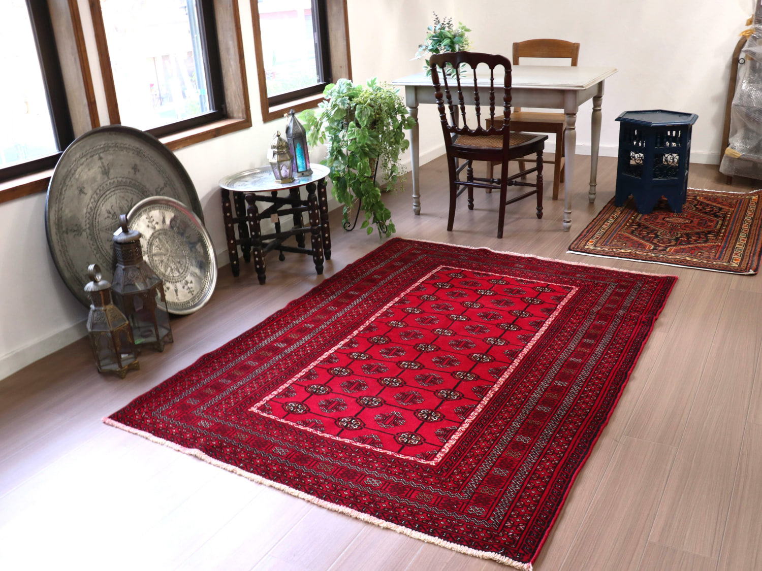 中央アジアからアフガン・パキスタンなどに住むトルクメン族のカーペット。ギュルと呼ばれる文様が連なる伝統的なデザインです。横幅が広い長方形で、使いやすい一枚。赤の色はずっしりと重たい感じではなく、わずかにピンクがかった明るめの色です。
