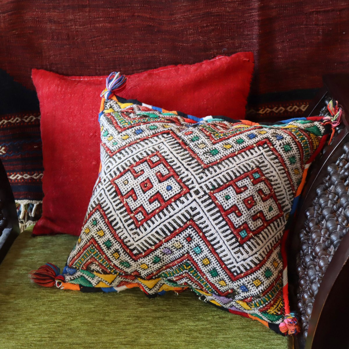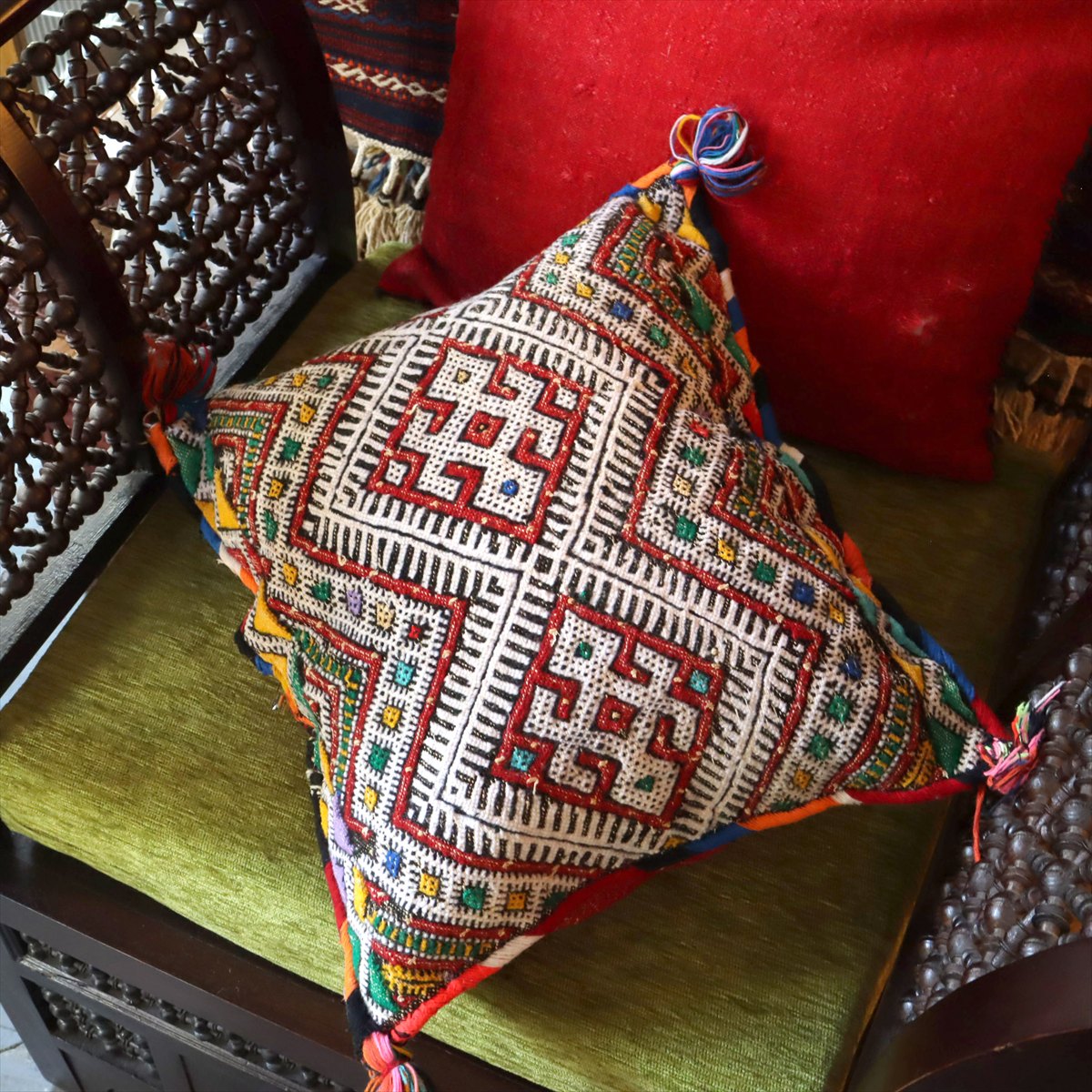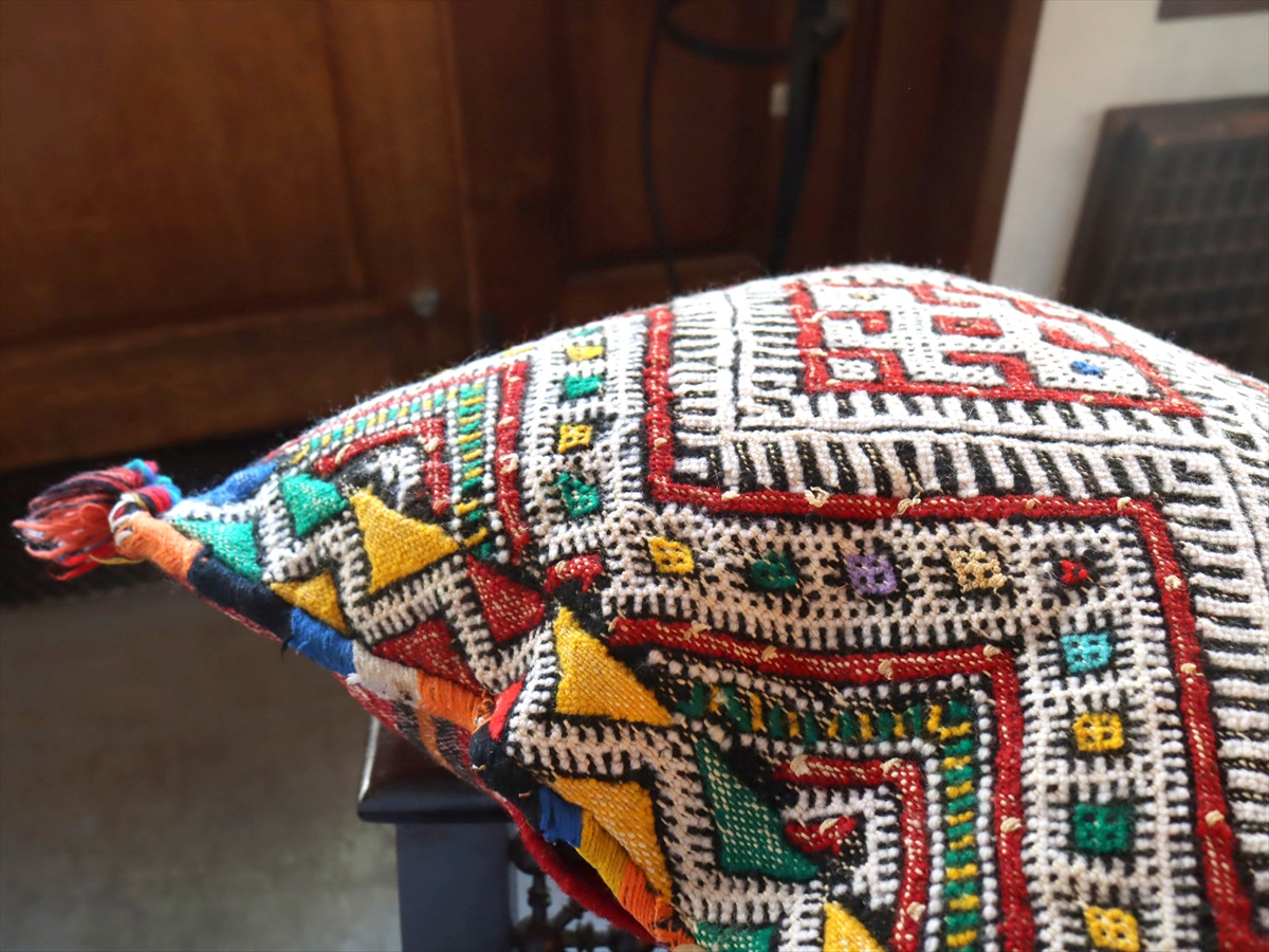 もともとクッションとして使うために織られたもので、四隅にはポンポンもつけられています。表面は刺繍のようにも見えますが、ベルベル族の伝統的な技法の織りです。(スマック織りのグループ)