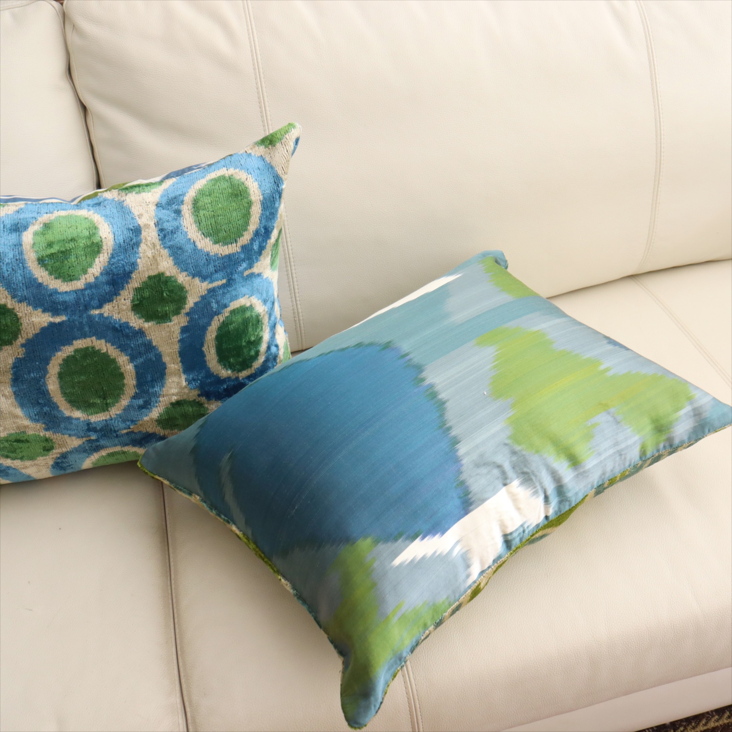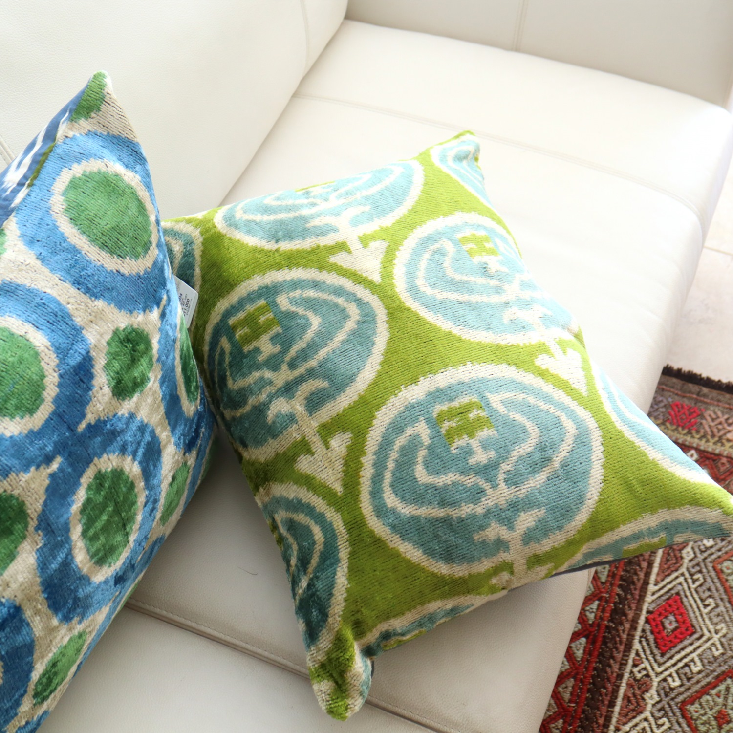 ウズベキスタンで「アトラス」と呼ばれる、中央アジアの女性たちの衣装用に織られた、手機織りの絣布(かすり・イカット)を使ったクッションカバー。