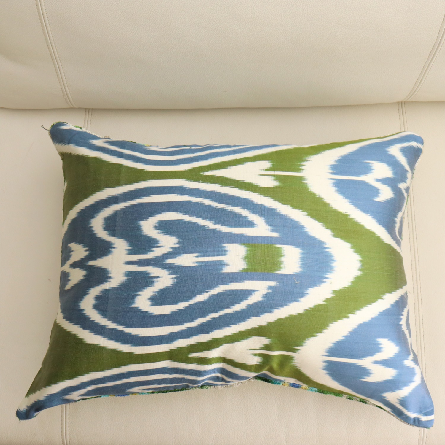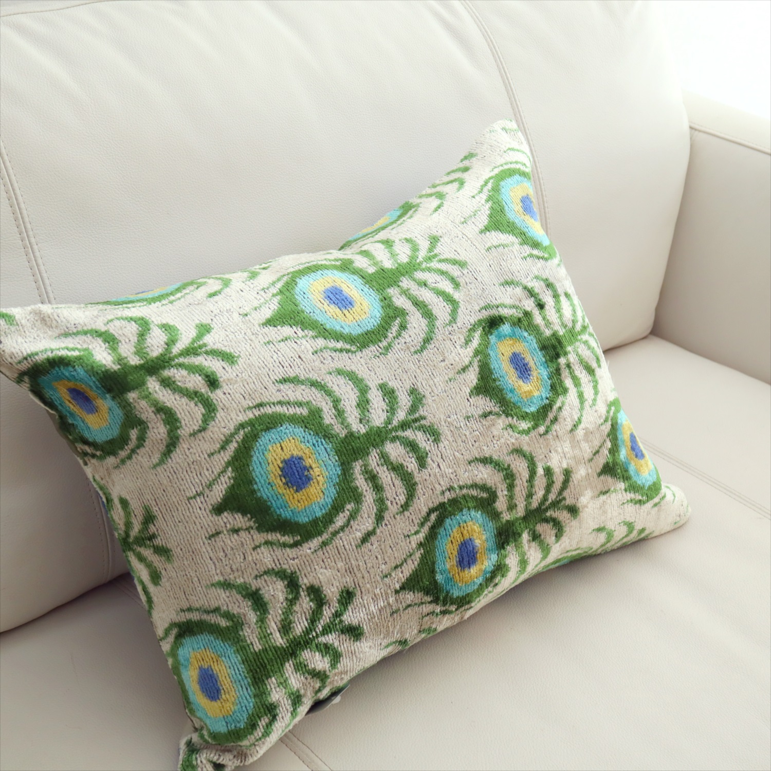 アトラス ベルベットイカットクッションカバー 両面シルク クジャクの羽 アイボリーxグリーン Silk Velvet Cushion - Double-Sided Design