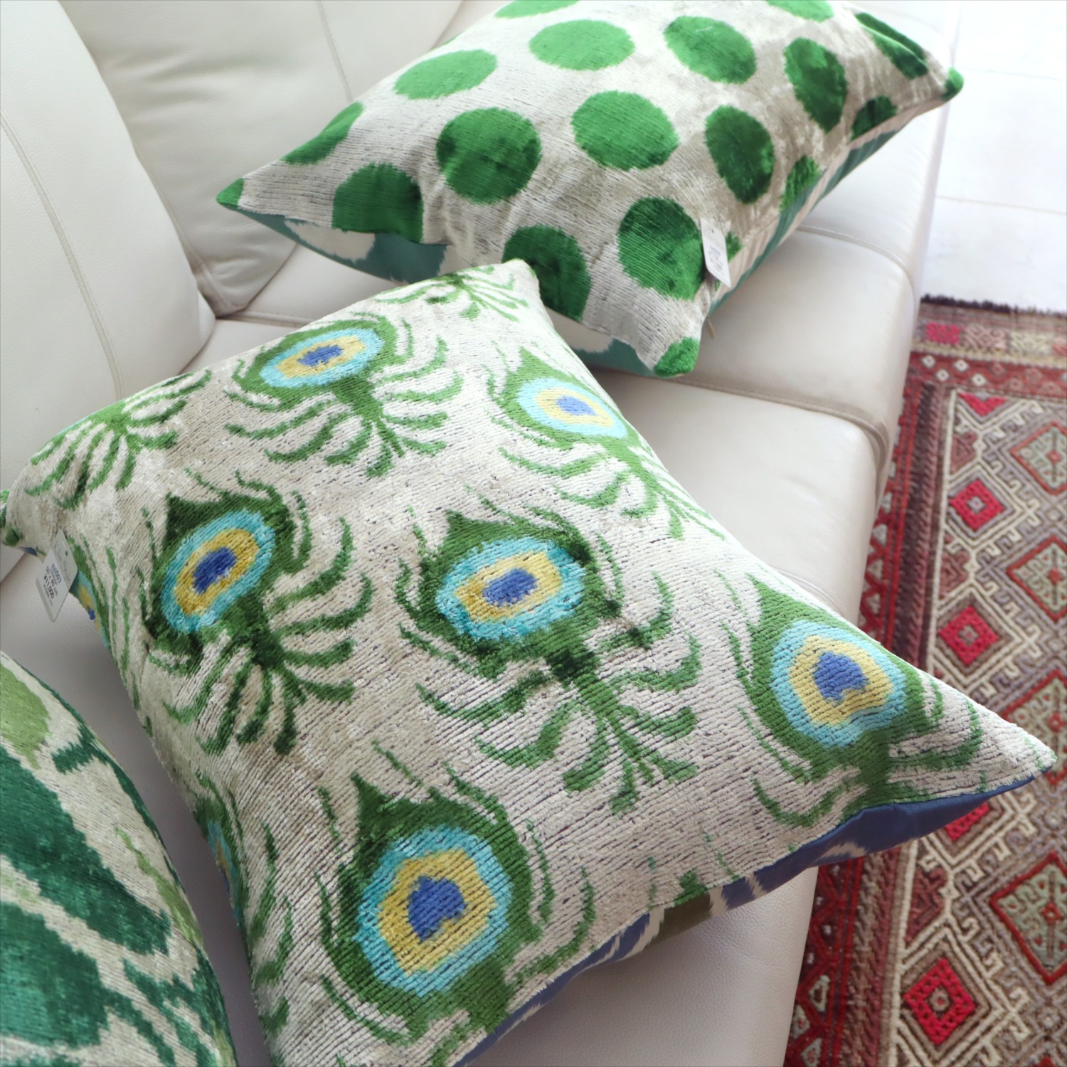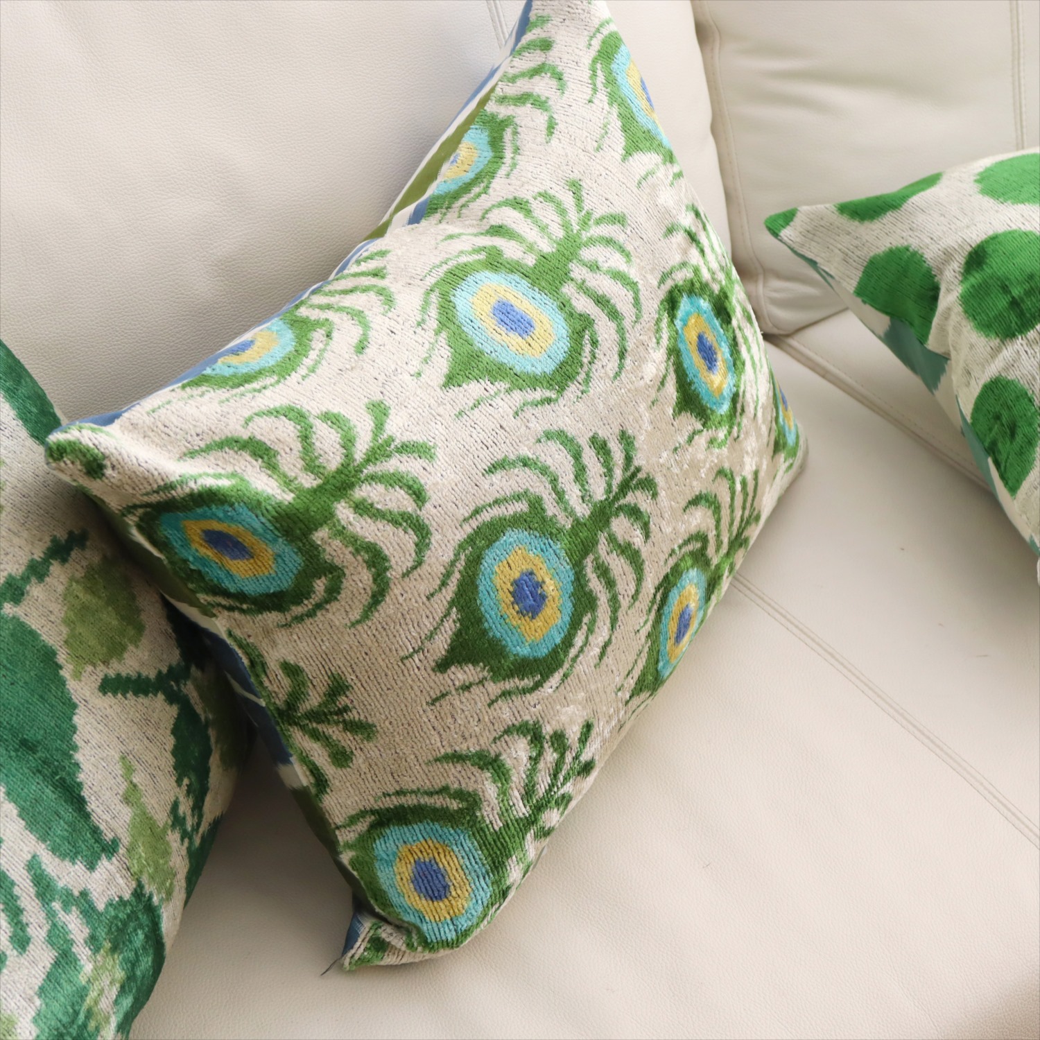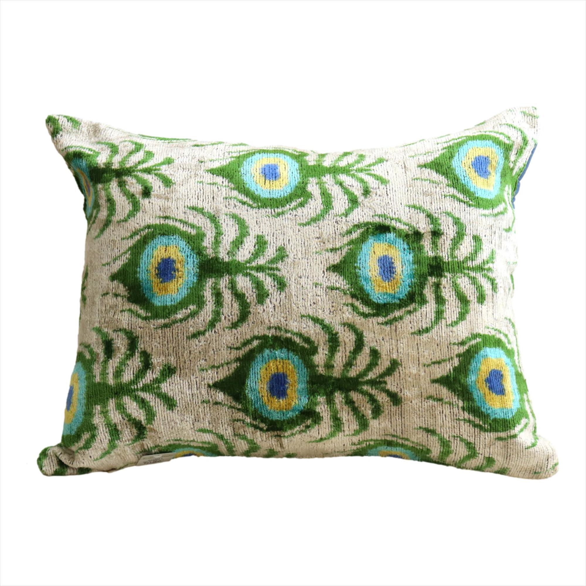 - アトラス ベルベットイカットクッションカバー 両面シルク クジャクの羽 アイボリーxグリーン Silk Velvet Cushion - Double-Sided Design