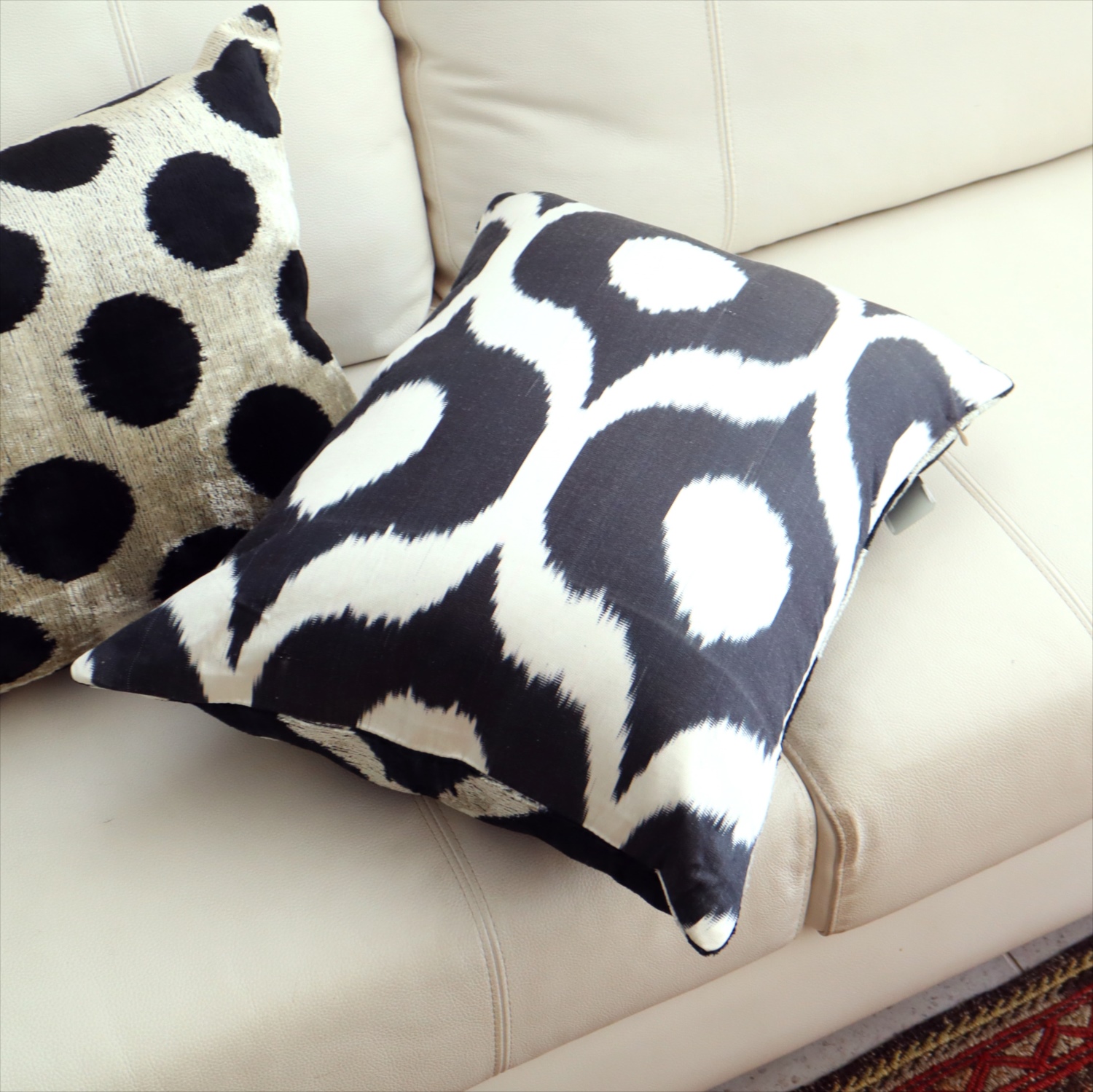 ウズベキスタンで「アトラス」と呼ばれる、中央アジアの女性たちの衣装用に織られた、手機織りの絣布(かすり・イカット)を使ったクッションカバー。