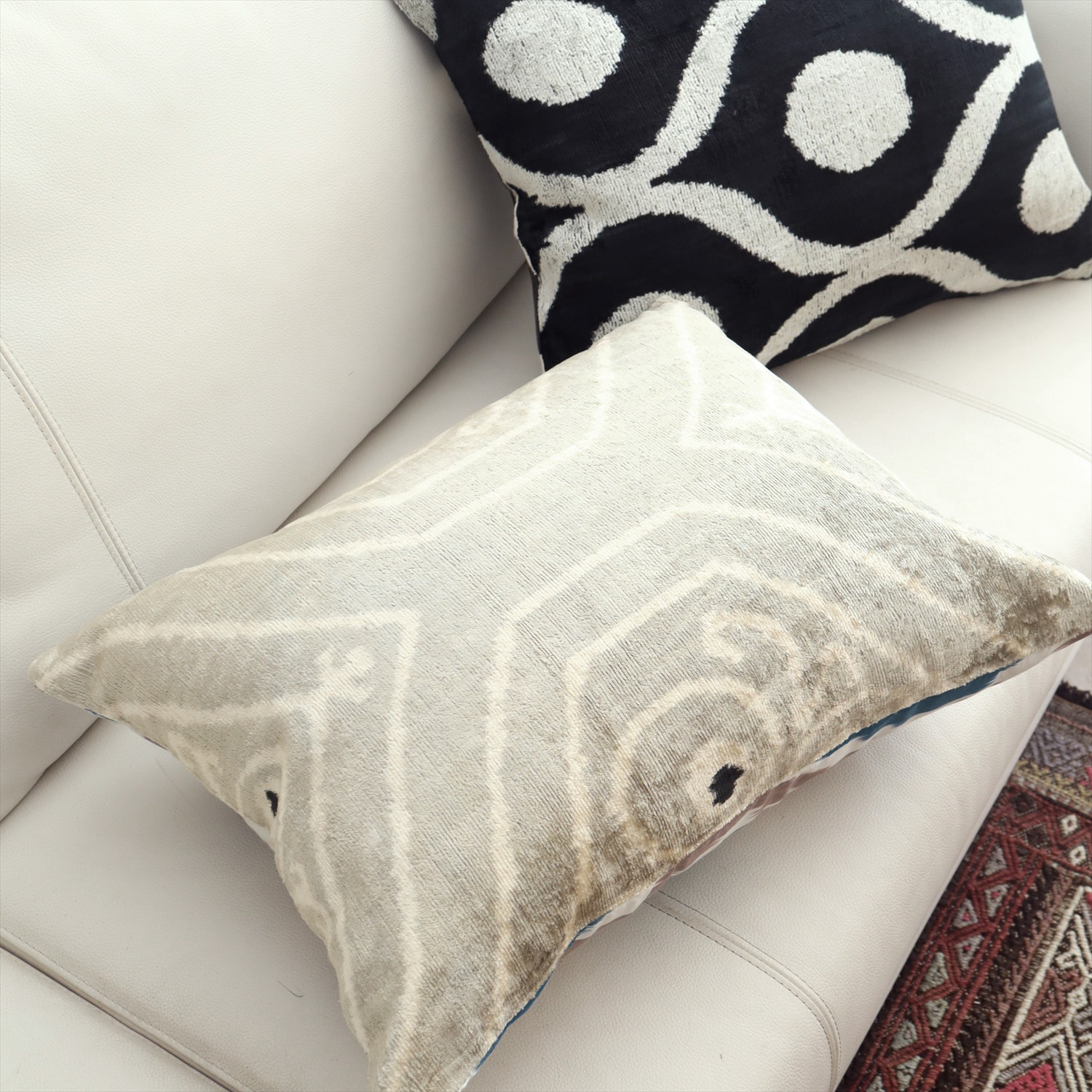 アトラス ベルベットイカットクッションカバー 両面シルク ライトグレー タイル柄 Silk Velvet Cushion - Double-Sided Design