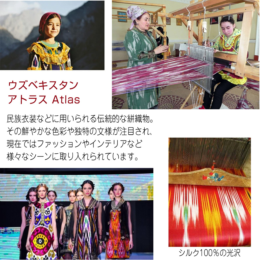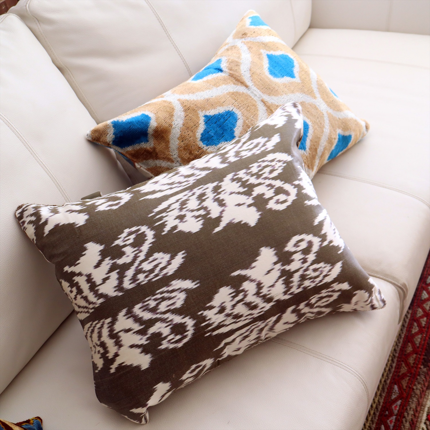 ウズベキスタンで「アトラス」と呼ばれる、中央アジアの女性たちの衣装用に織られた、手機織りの絣布(かすり・イカット)を使ったクッションカバー。