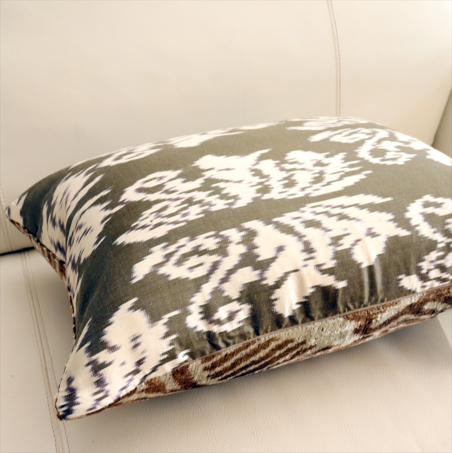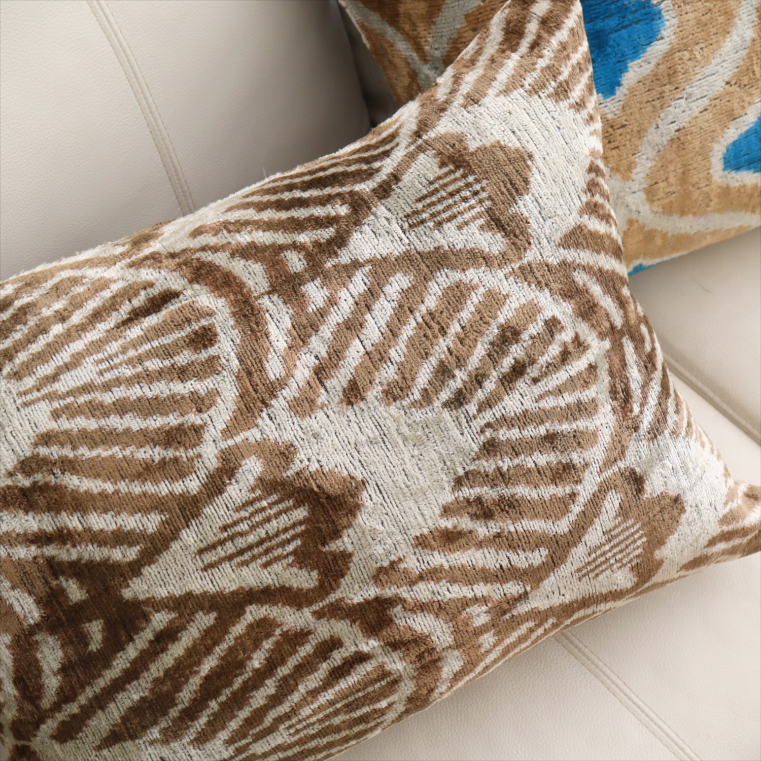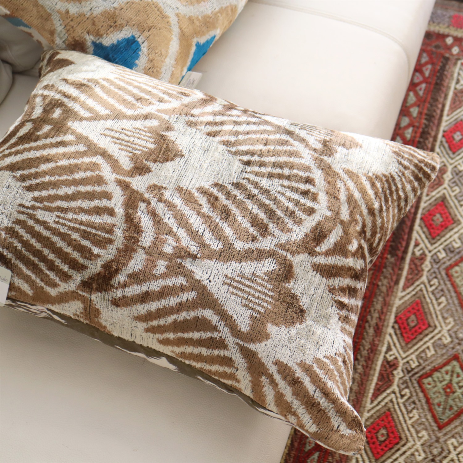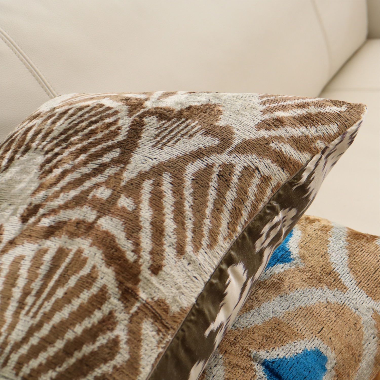 - アトラス ベルベットイカットクッションカバー 両面シルク 扇 羽 ブラウン Silk Velvet Cushion - Double-Sided Design