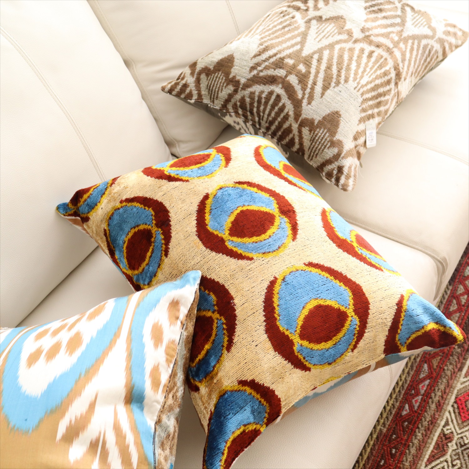 ウズベキスタンで「アトラス」と呼ばれる、中央アジアの女性たちの衣装用に織られた、手機織りの絣布(かすり・イカット)を使ったクッションカバー。