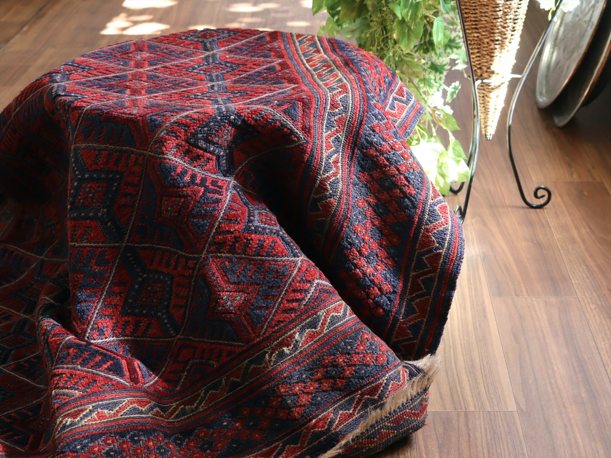 アフガニスタン東部、イランと国境を接するエリアの緻密な織りのキリムです。細かい織り目のスマック織りをベースに、立体感のあるカーペット織りでモチーフをレリーフのように織り込んだ1枚。