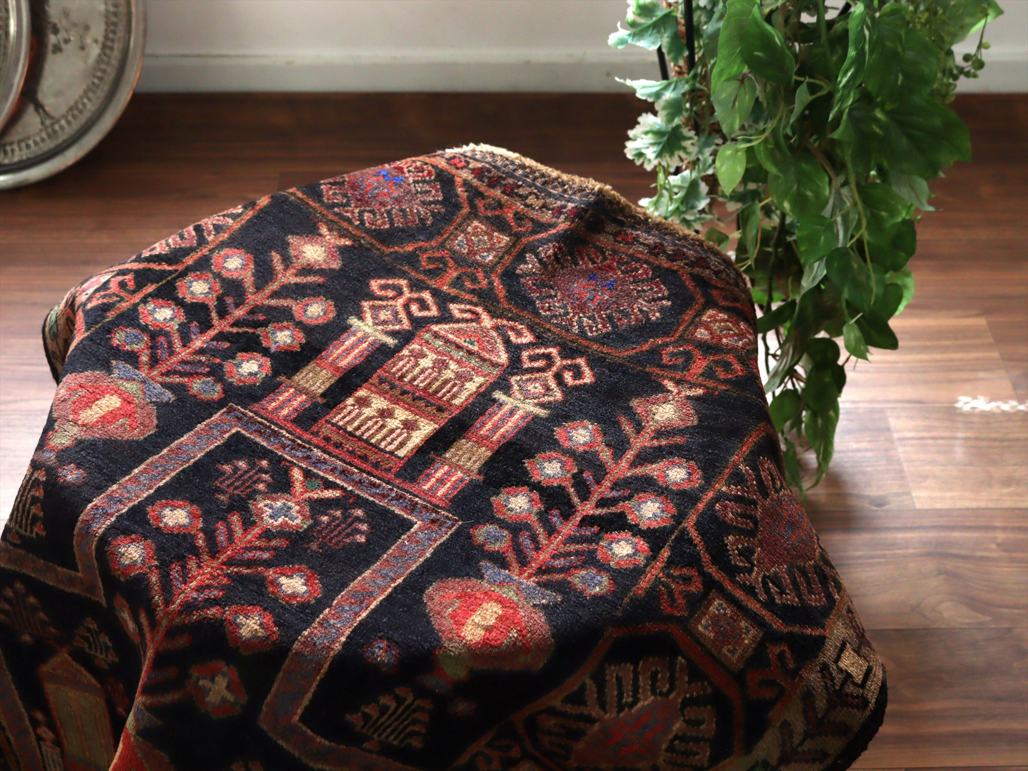 ブラックベースにお祈りのくぼみを示すミフラープがおかれたデザイン。幾何学模様や小花、植物などが一面に織られていて、ベースの色は落ち着いていながらも賑やかな1枚です。