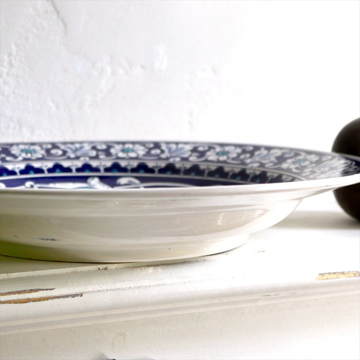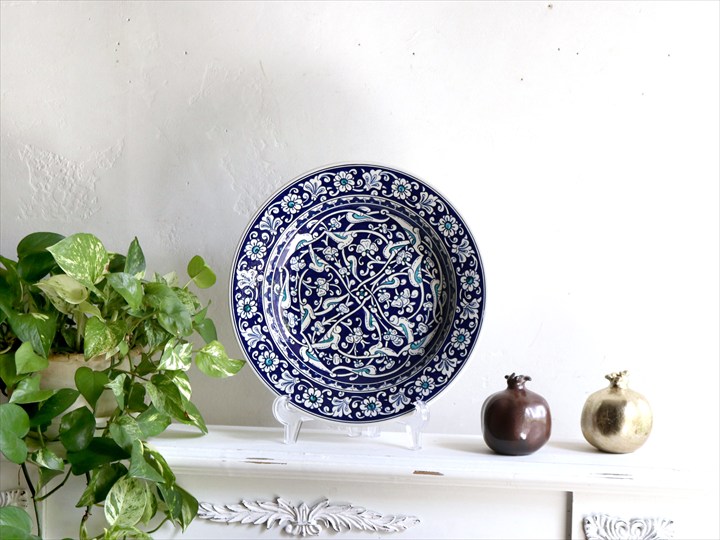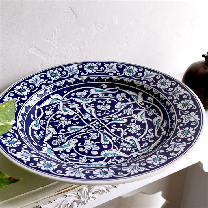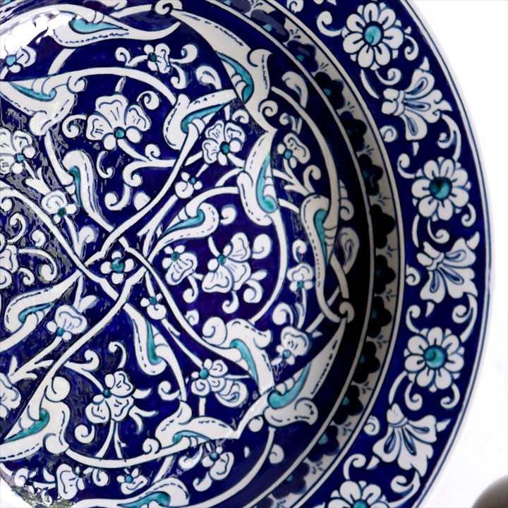 オスマントルコ宮廷へ献上するために、イズニックで陶器製作が始まった16世紀初頭に作られた絵皿を再現しています。青の濃淡を使って、緻密な筆遣いで描かれたデザインは、明代中国の影響を強くうけつつも、無限の広がりを表現するイスラミックモチーフに変化しています。