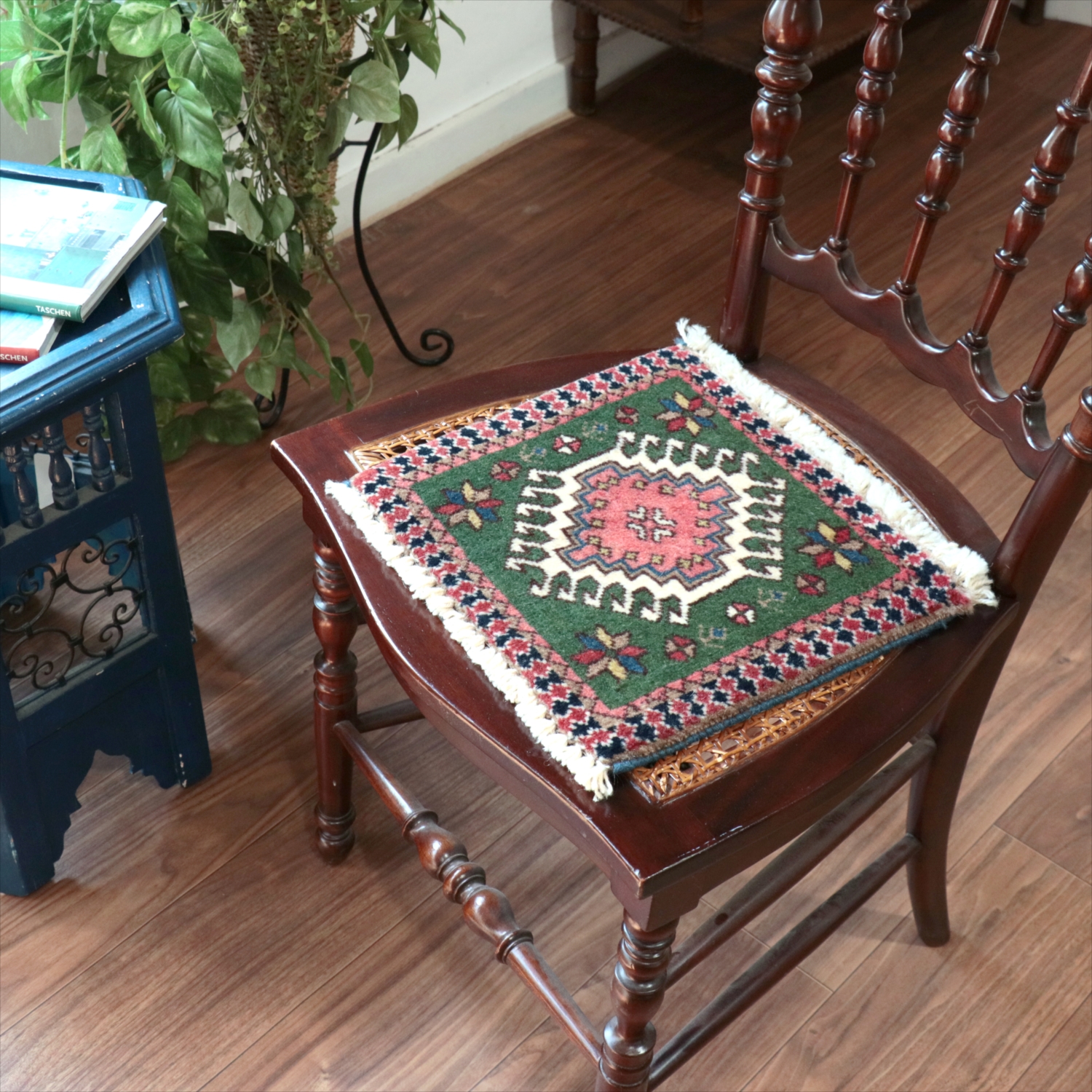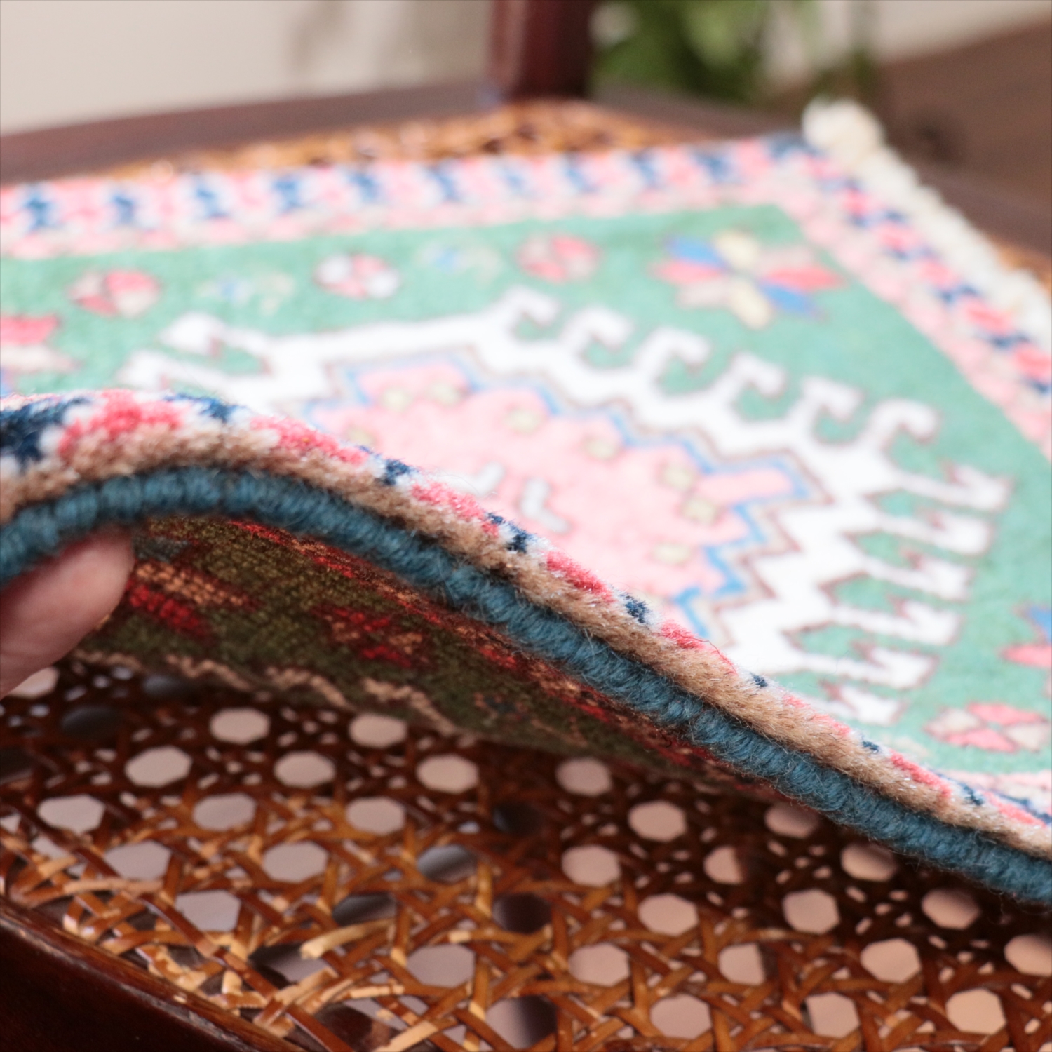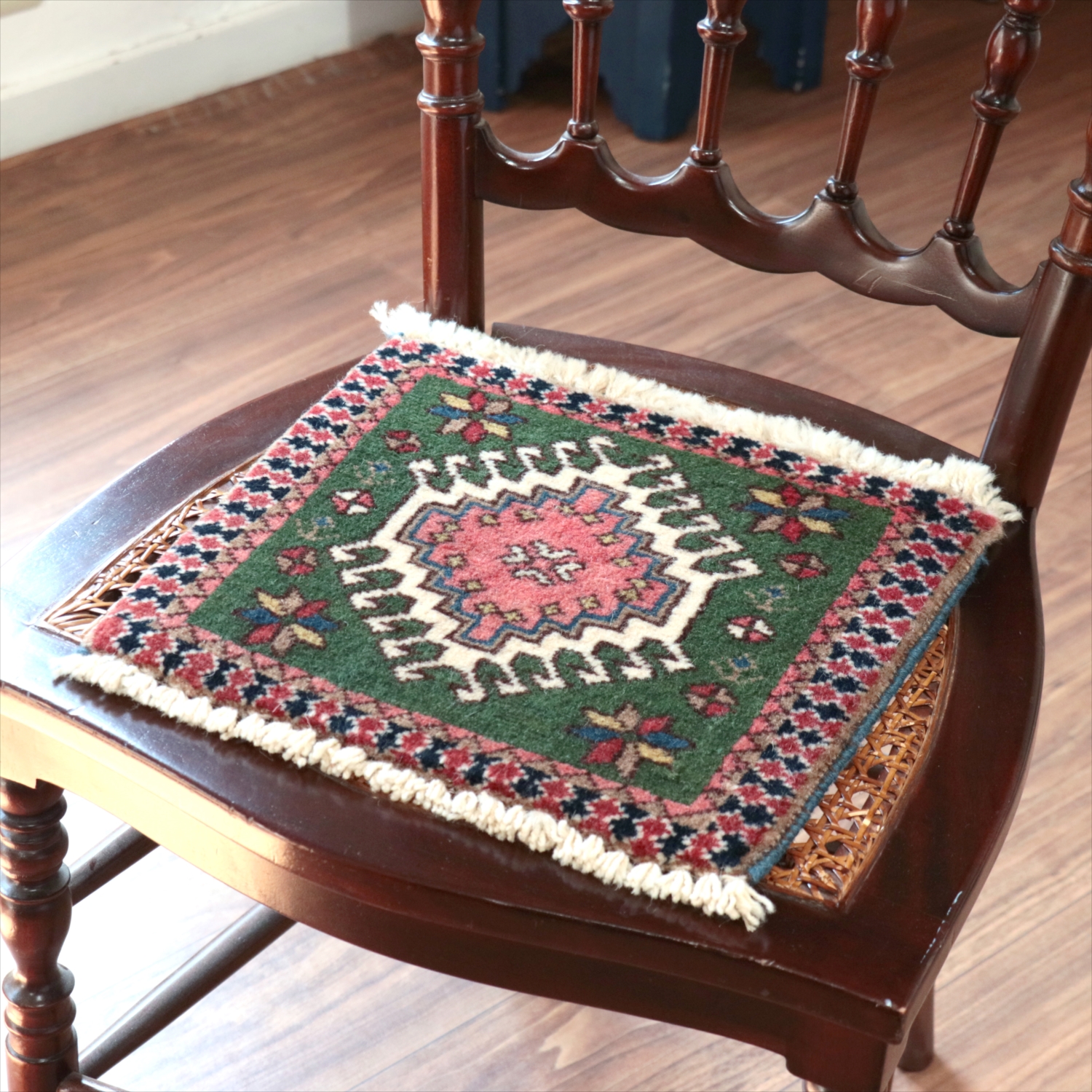 30cm角のミニサイズのラグ。小さいながらも、織りはしっかりしていて本格的です。多少ゆがみが気になりますが、ゆがみも含めて素朴な感じをお楽しみいただければと思います。