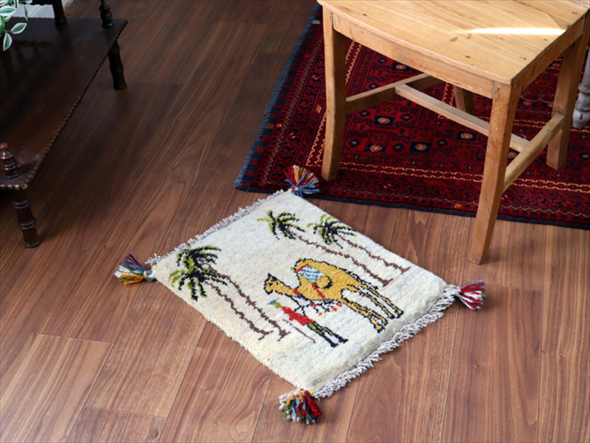 - 【15%OFF】ギャッベ イラン産手織り 座布団サイズ 45×39cm ナチュラルアイボリー ラクダと遊牧民