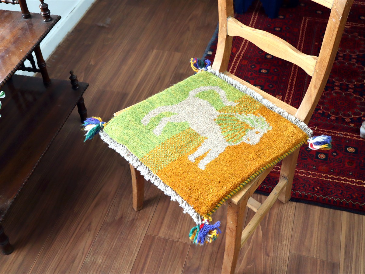 【15%OFF】ギャッベ イラン産手織り 座布団サイズ 40×38cm グリーン&イエロー ライオン