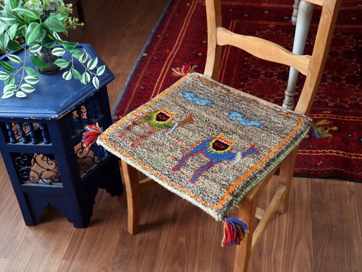 - 【15%OFF】ギャッベ イラン産手織り 座布団サイズ 41×42cm ナチュラルブラウングレー カラフルなラクダ