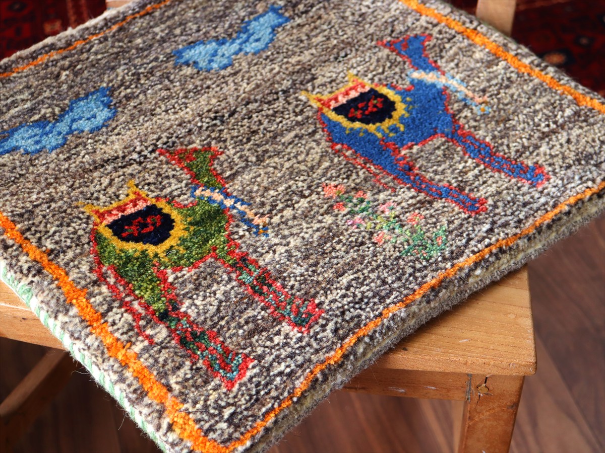 【15%OFF】ギャッベ イラン産手織り 座布団サイズ 41×42cm ナチュラルブラウングレー カラフルなラクダ
