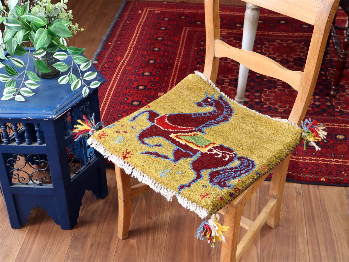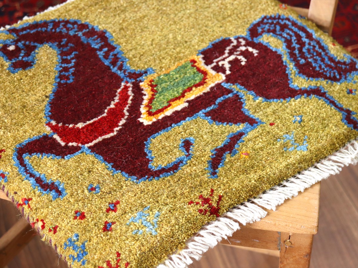 【15%OFF】ギャッベ イラン産手織り 座布団サイズ 41×44cm モスグリーン 躍動する馬