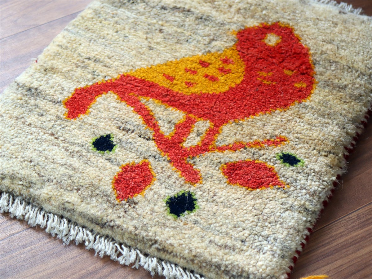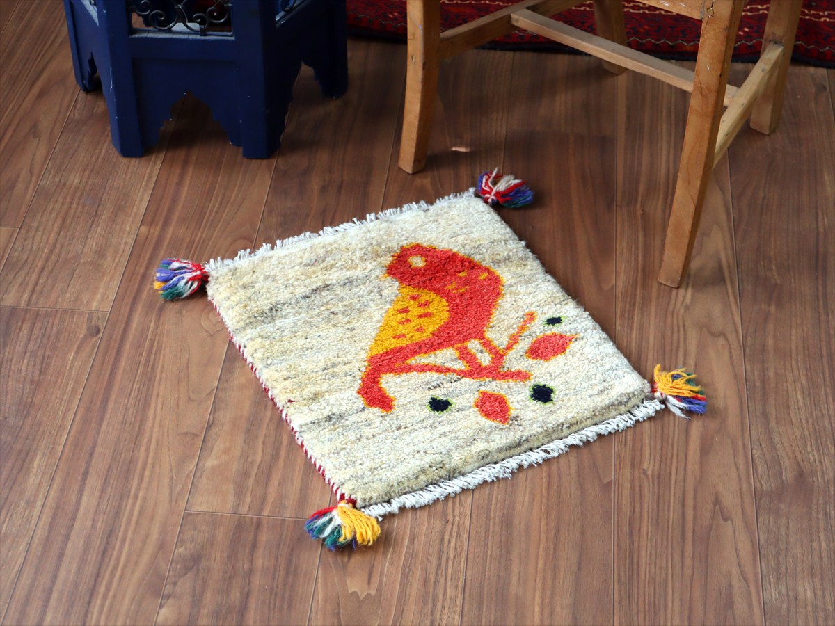 【15%OFF】ギャッベ イラン産手織り 座布団サイズ 42×39cm ナチュラルアイボリー 佇んでいる小鳥