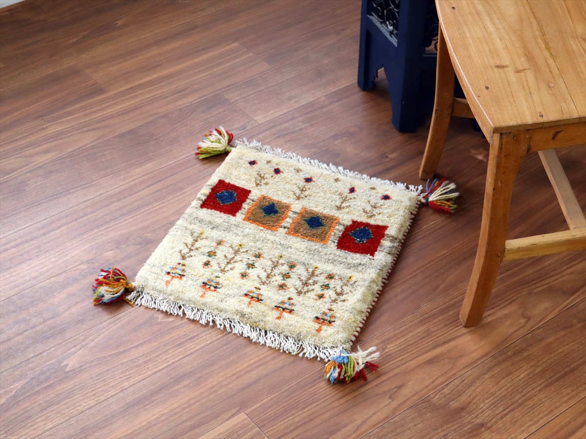 【15%OFF】ギャッベ イラン産手織り 座布団サイズ 43×40cm ナチュラルアイボリー 生命の木