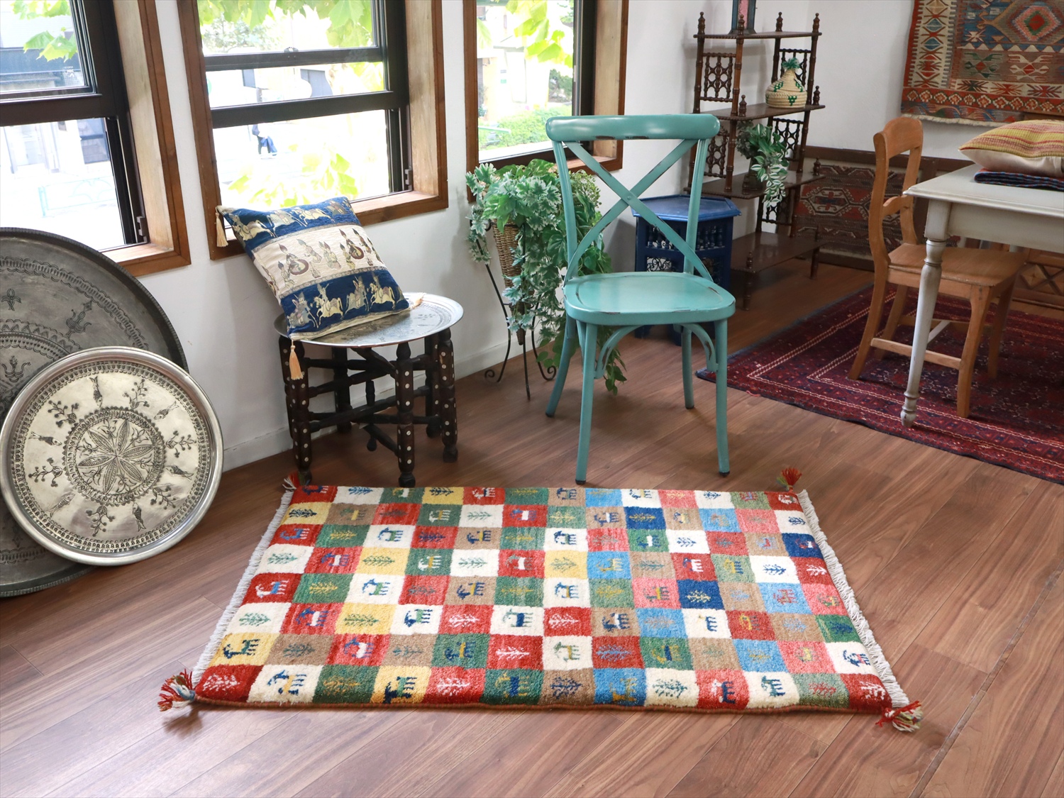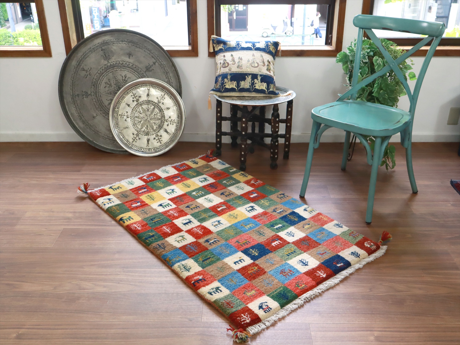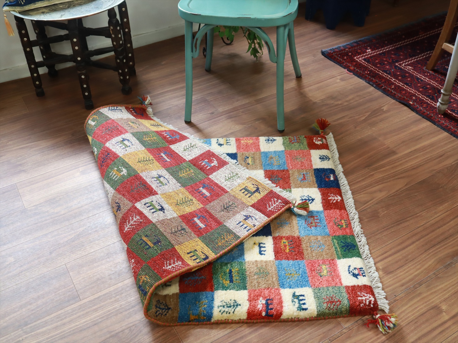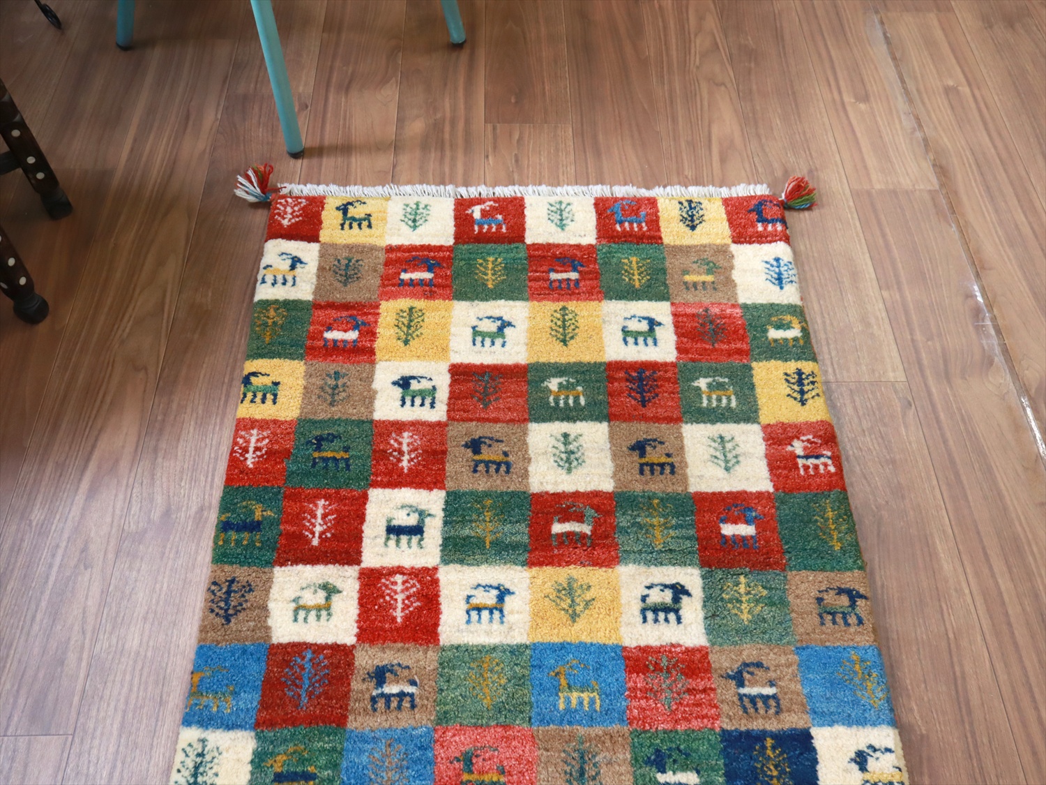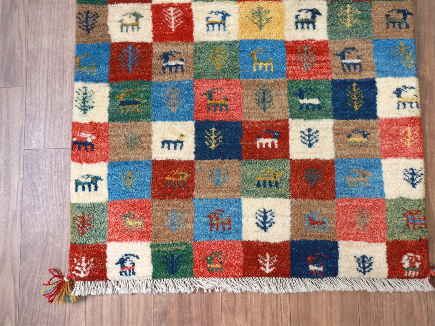 モダンなデザインに見えますが、カラフルなタイル柄もカシュカイ族の伝統柄のひとつ。タイルの配色が、向かって上半分と下半分で異なっているのがユニークです。小さな動物や草花のモチーフのひとつひとつに個性があって、見ていて楽しいギャッベです。